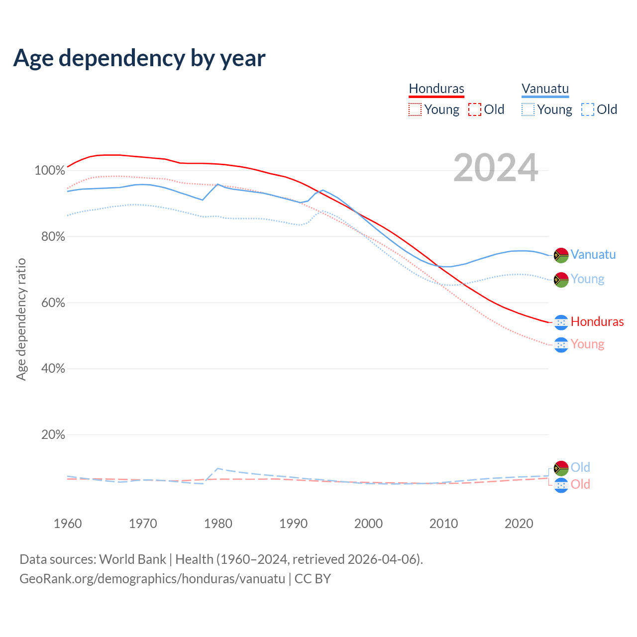 - Honduras is ranked 134/196 by median age (oldest to youngest) vs 156/196 for Vanuatu.