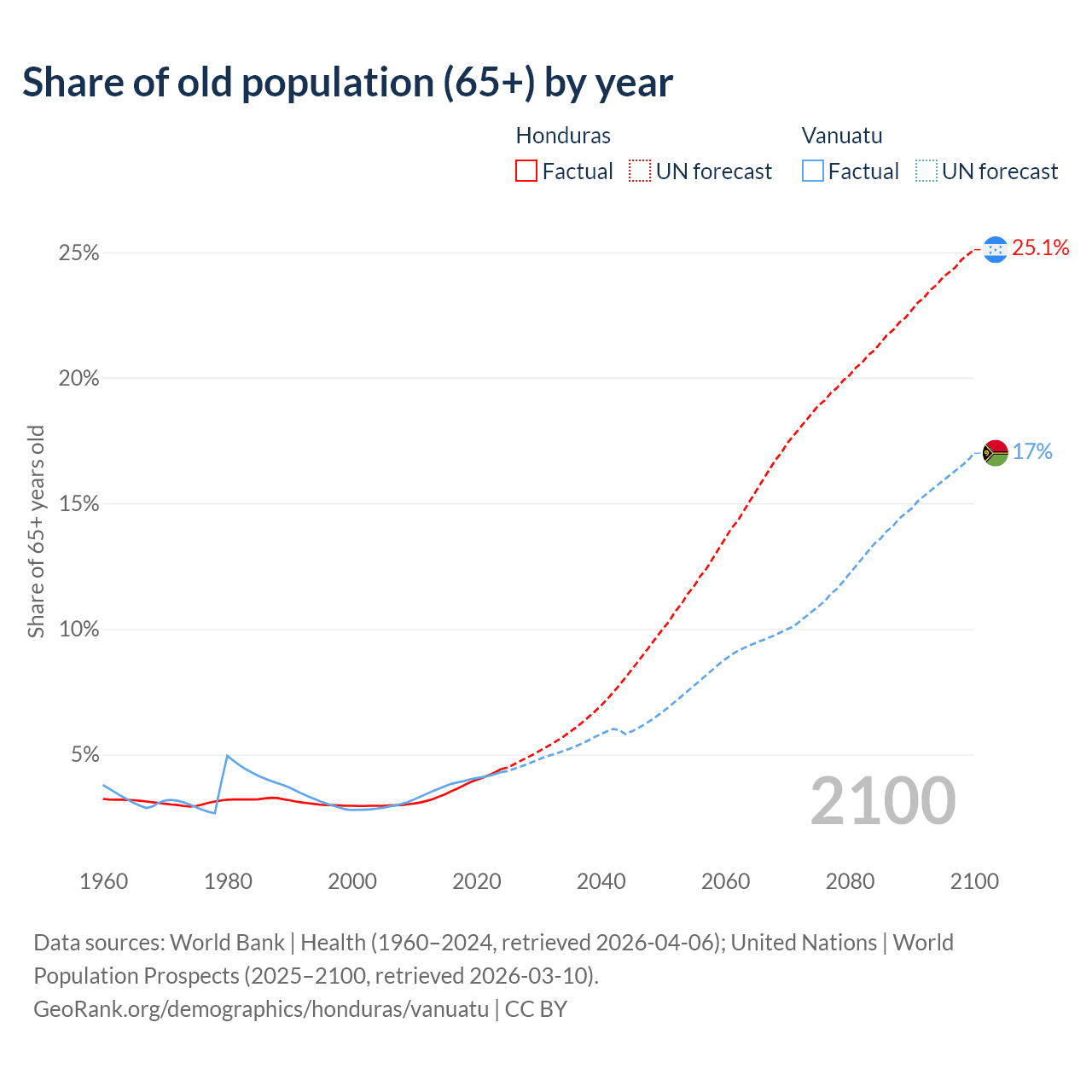 The share of older people aged 65 and over is 4.42% in Honduras and 4.3% in Vanuatu. Life expectancy in Honduras compared to Vanuatu .