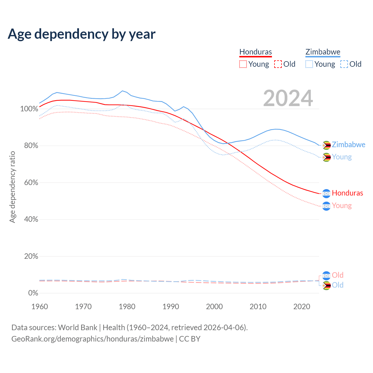 - The share of old-age demographic (65+) in Honduras is 4.42% vs 3.6% in Zimbabwe.