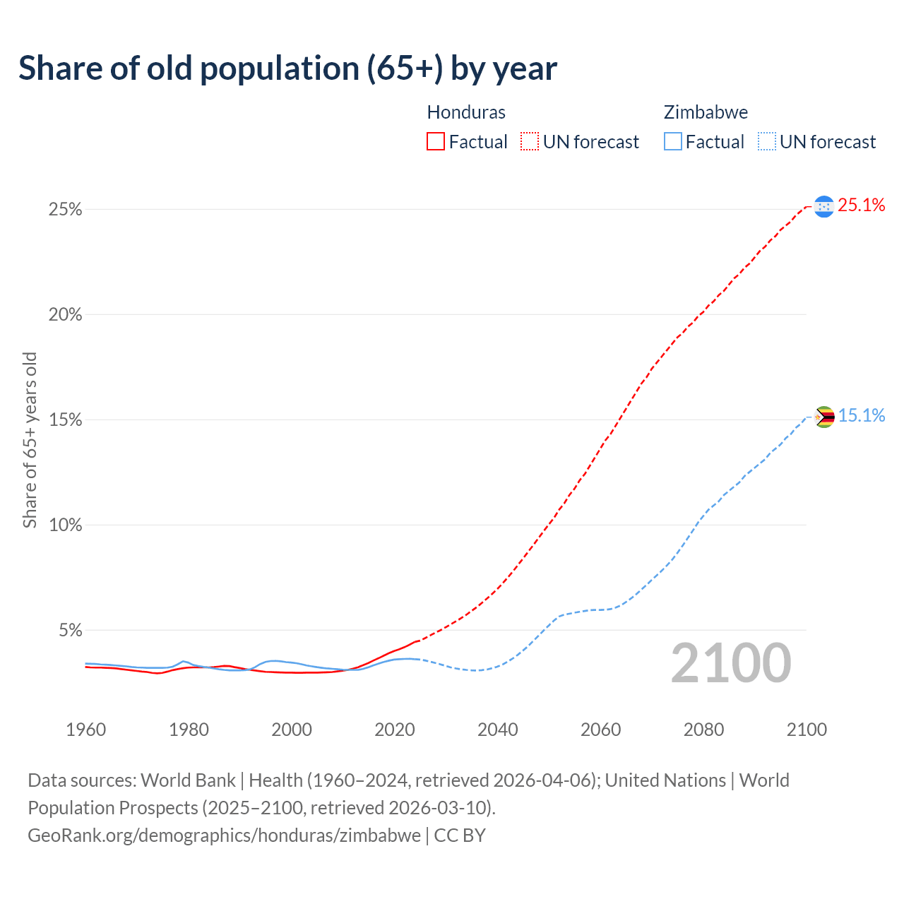 The share of older people aged 65 and over is 4.42% in Honduras and 3.6% in Zimbabwe. Life expectancy in Honduras compared to Zimbabwe .