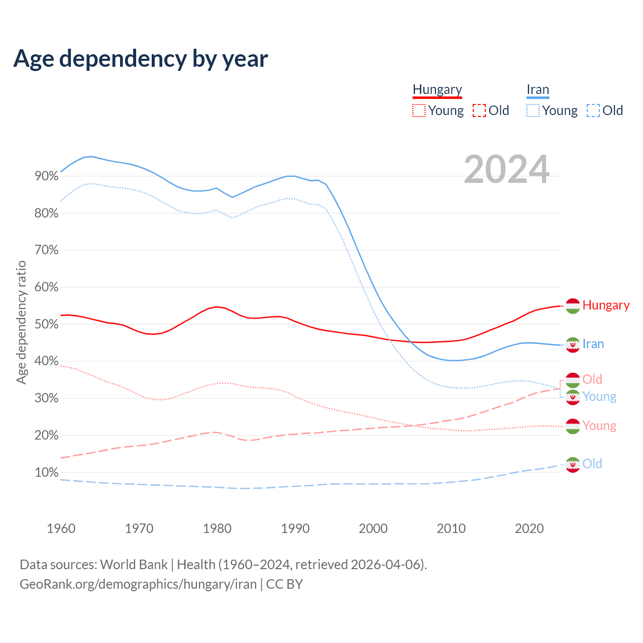 - Hungary is ranked 17/196 by median age (oldest to youngest) vs 79/196 for Iran.
