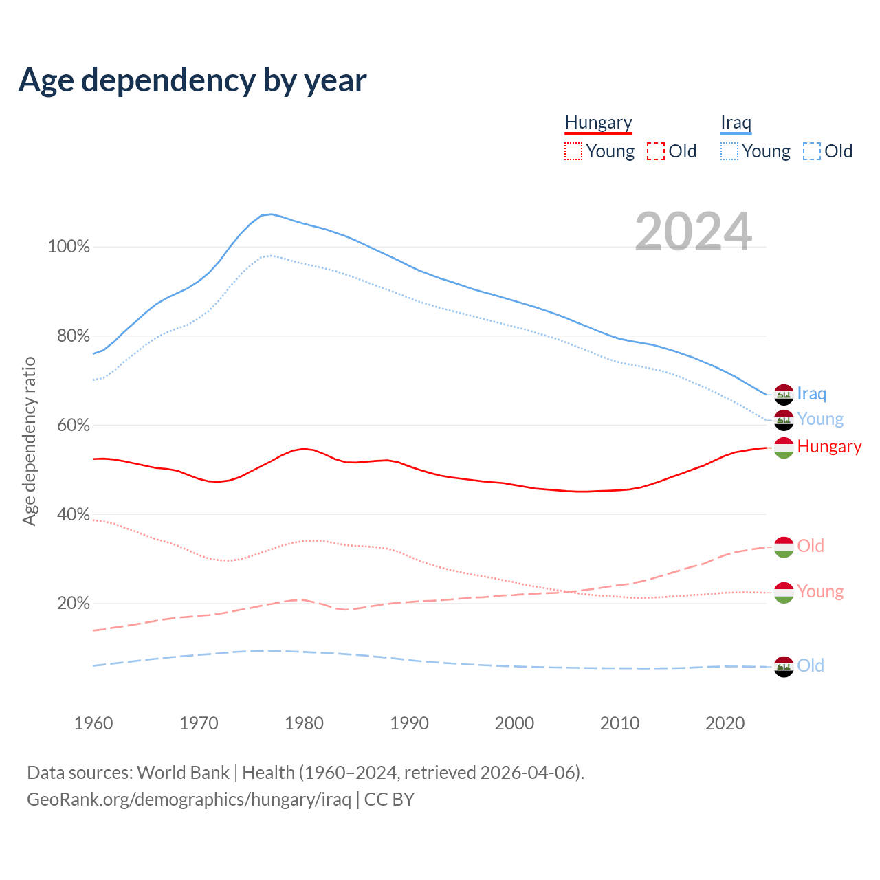 - Hungary is ranked 17/196 by median age (oldest to youngest) vs 151/196 for Iraq.