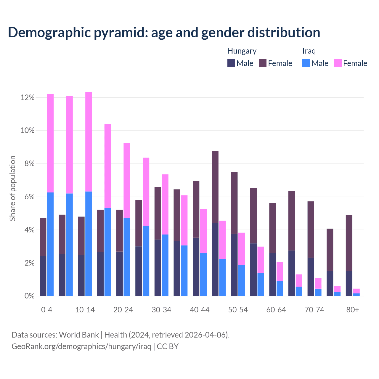 - As of 2026, the population of Hungary is 9.48M vs 48.3M in Iraq - 5.1 times difference.