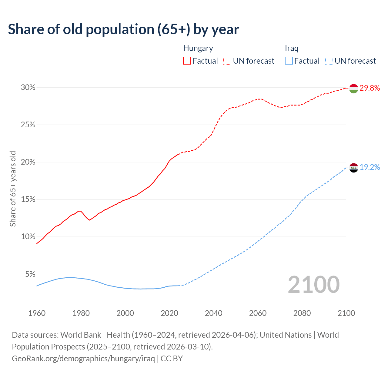 The share of older people aged 65 and over is 21% in Hungary and 3.41% in Iraq. Life expectancy in Hungary compared to Iraq .