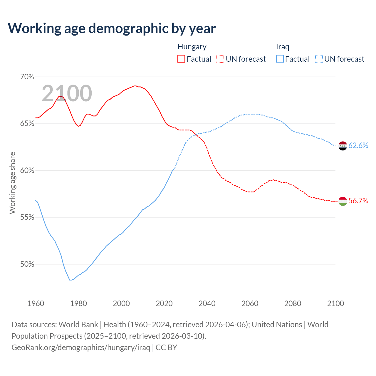 - Hungary has 6.12M working age adults (aged 15-64) vs 29M in Iraq.