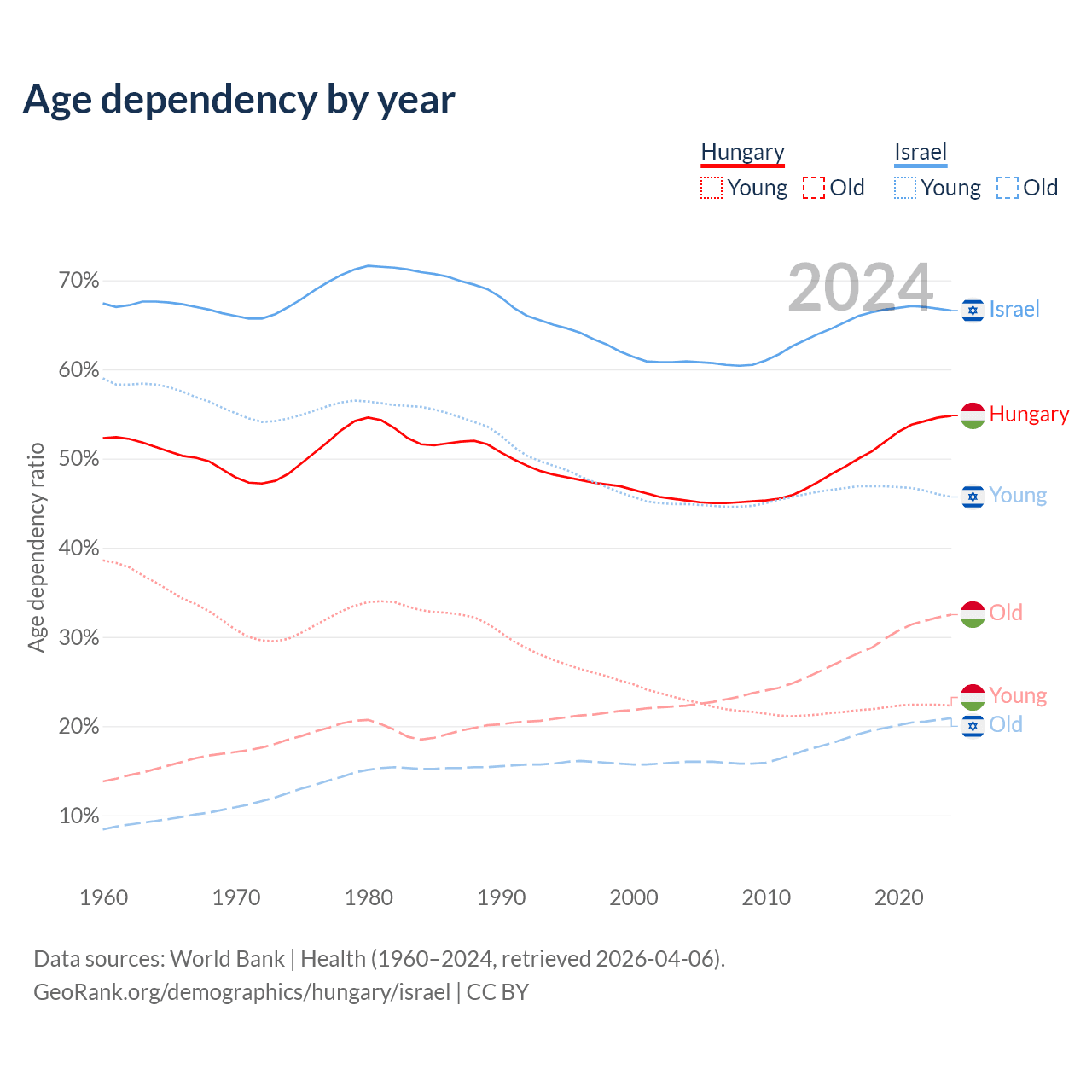 - Hungary is ranked 17/196 by median age (oldest to youngest) vs 103/196 for Israel.