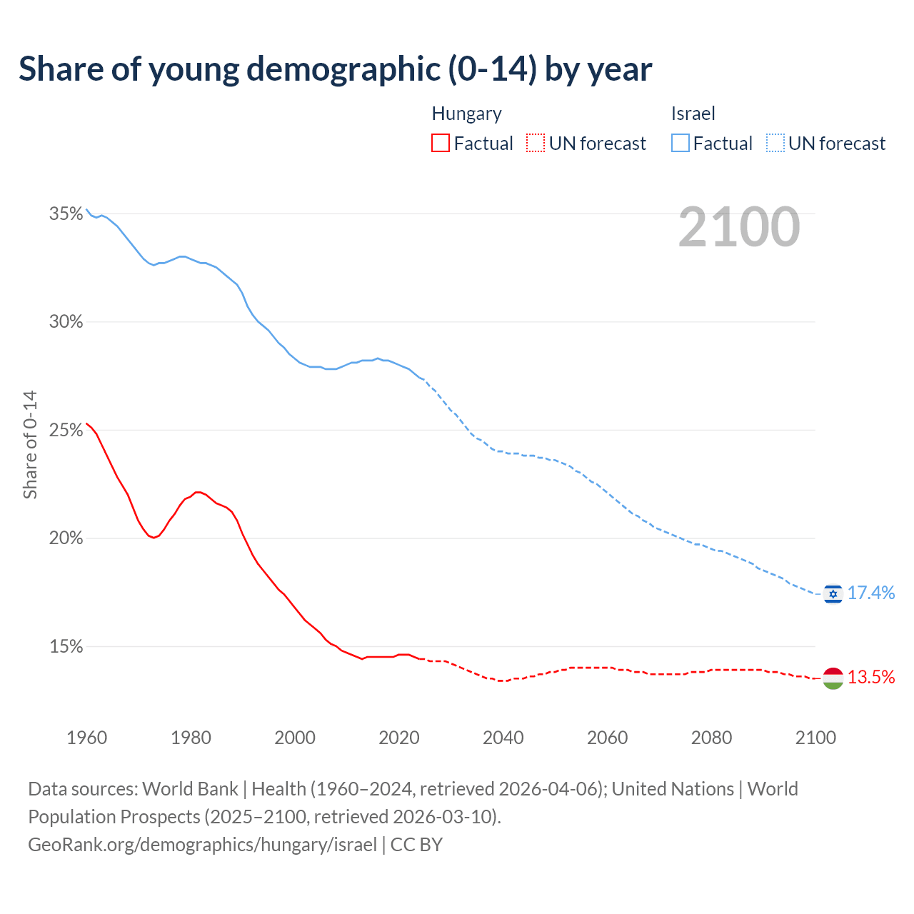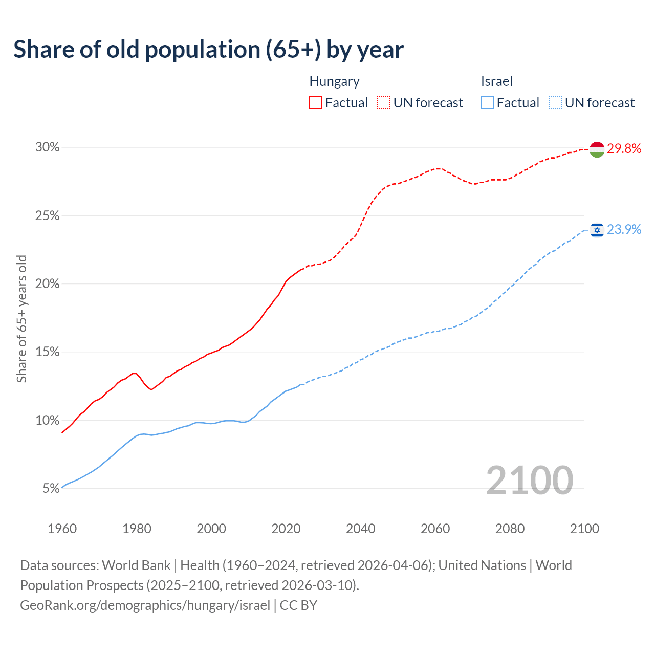 Median age Hungary vs Israel, 1960-2100