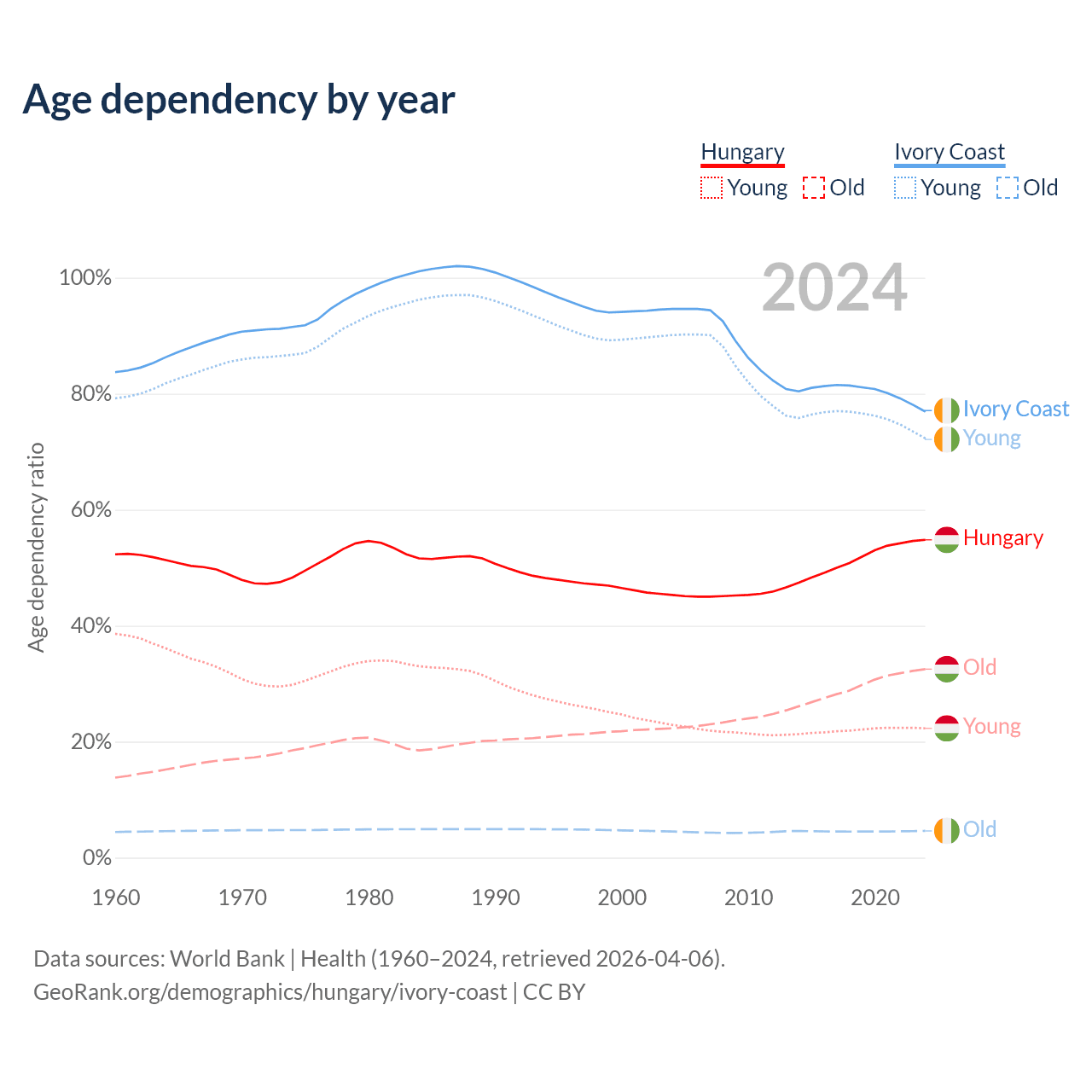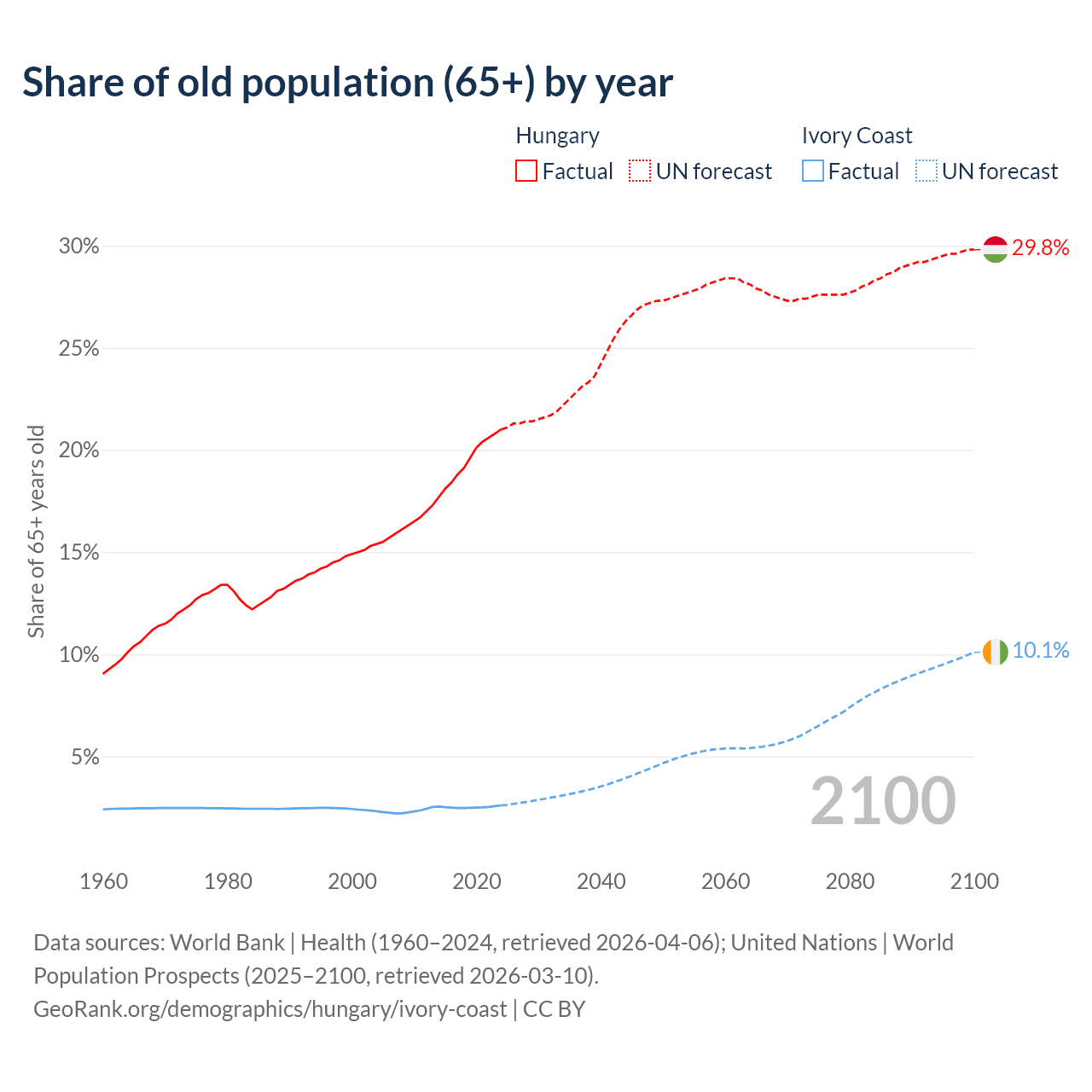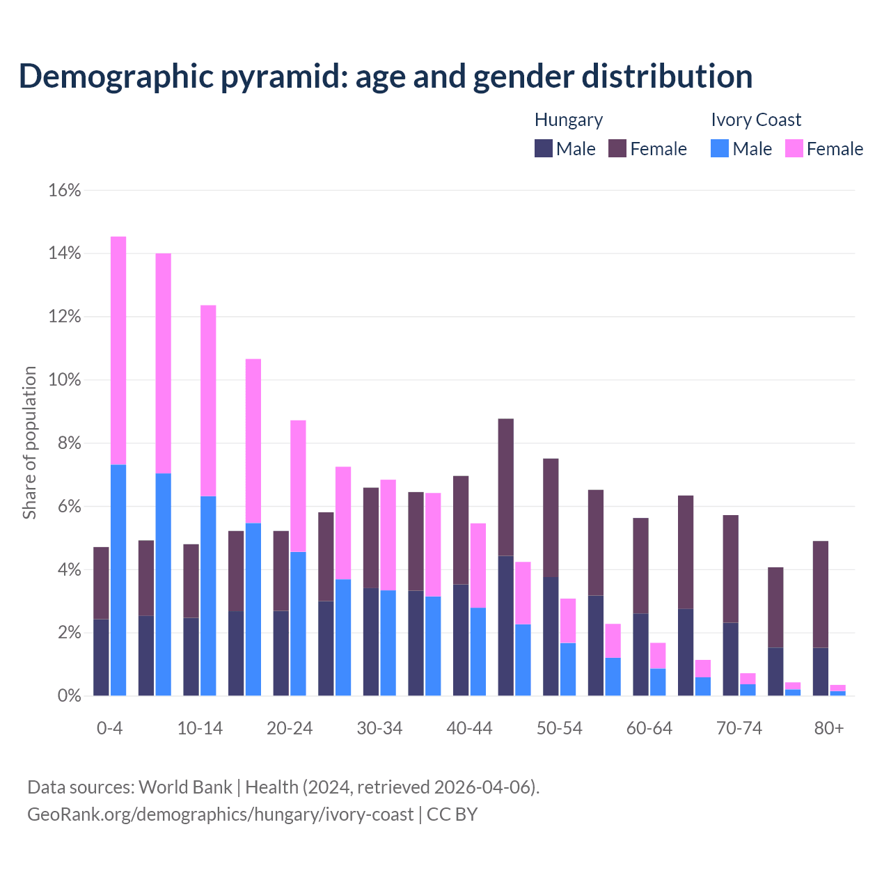 The share of older people aged 65 and over is 21% in Hungary and 2.61% in Ivory Coast. Life expectancy in Hungary compared to Ivory Coast .