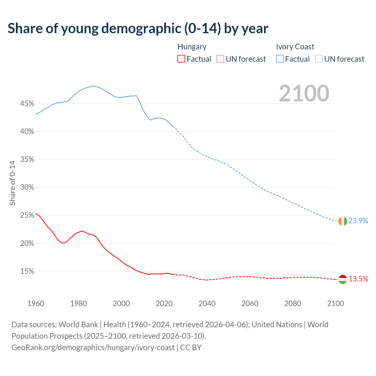 - The share of young demographic (0-15 years old) in Hungary is 14.4% vs 40.9% in Ivory Coast.