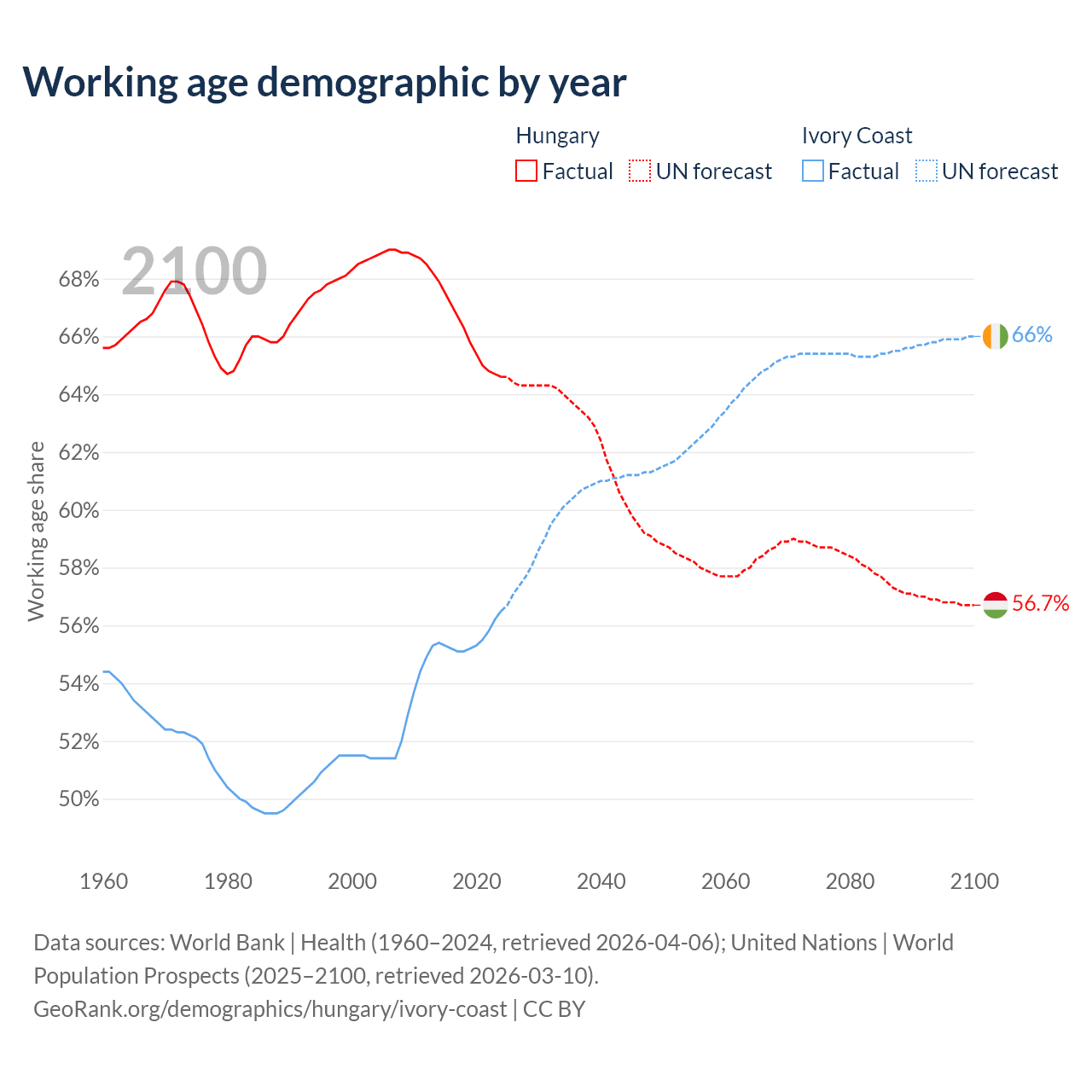 Median age Hungary vs Ivory Coast, 1960-2100