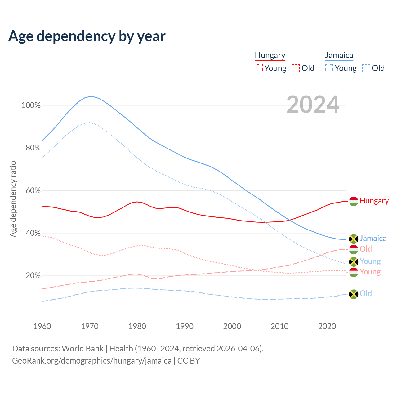 The share of older people aged 65 and over is 21% in Hungary and 8.21% in Jamaica. Life expectancy in Hungary compared to Jamaica .