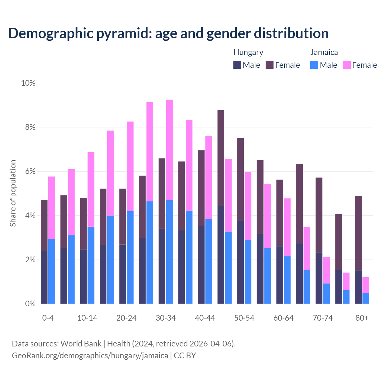 - Hungary is ranked 17/196 by median age (oldest to youngest) vs 87/196 for Jamaica.