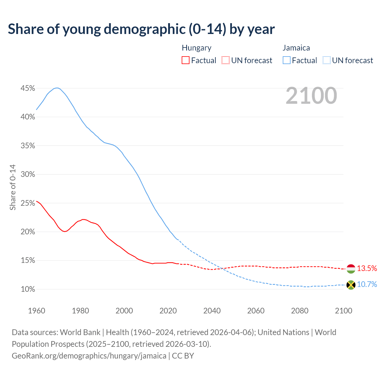 - The share of young demographic (0-15 years old) in Hungary is 14.4% vs 18.7% in Jamaica.