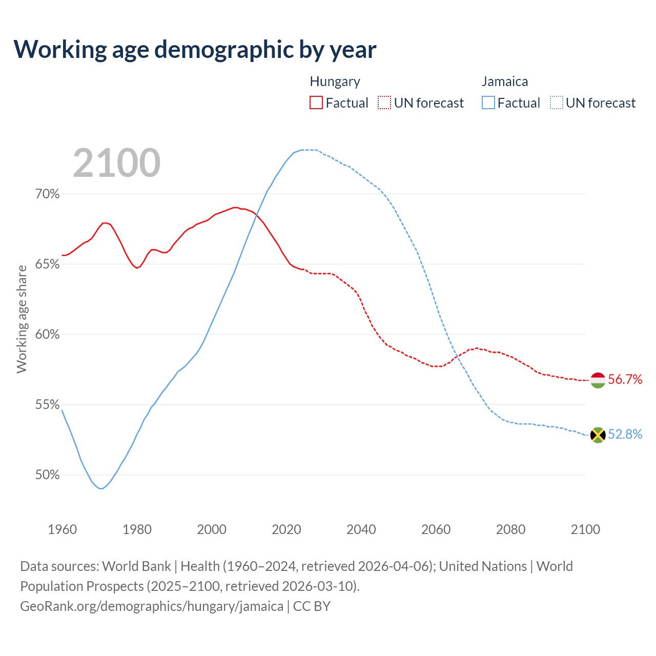 - Hungary has 6.12M working age adults (aged 15-64) vs 2.07M in Jamaica.