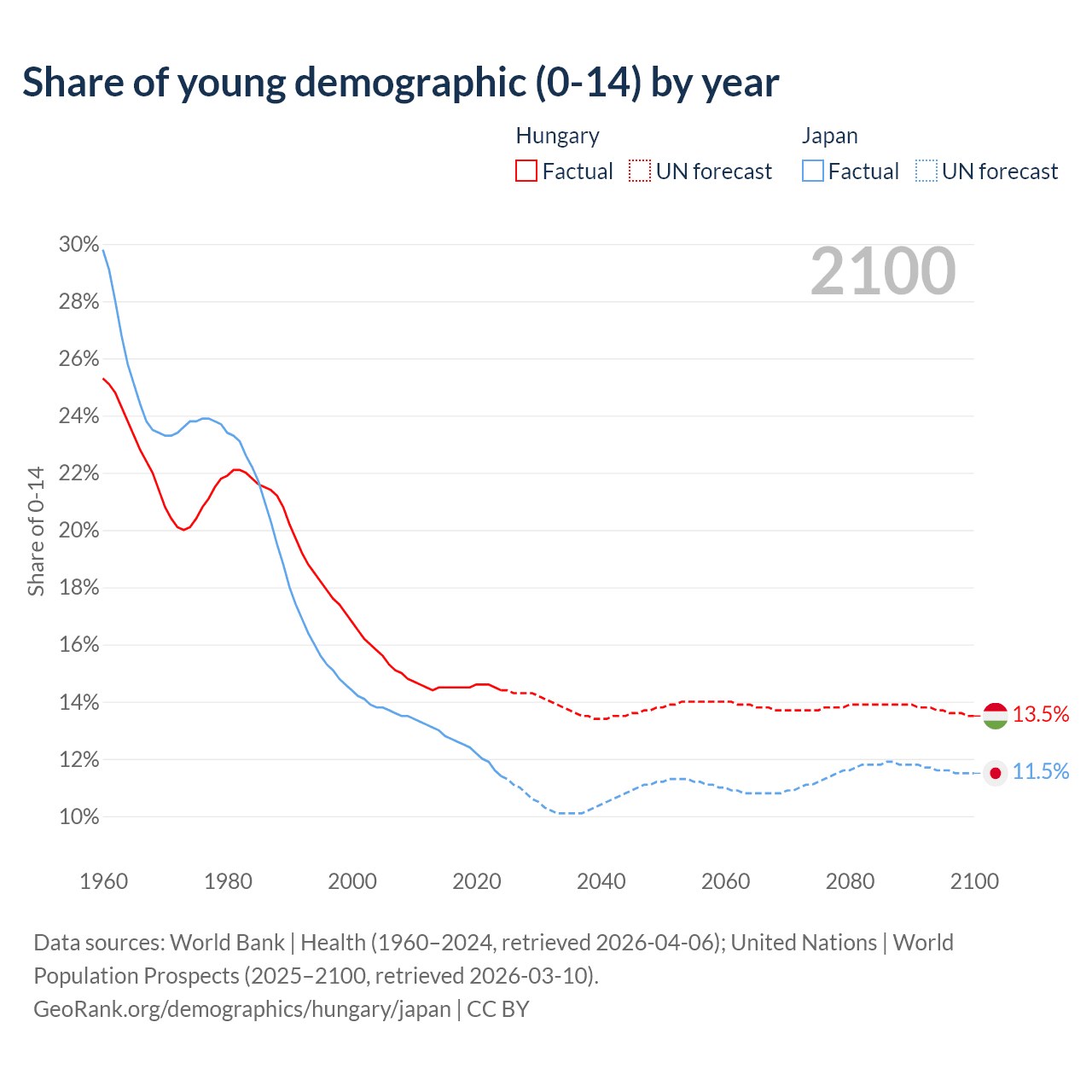 - The share of young demographic (0-15 years old) in Hungary is 14.4% vs 11.4% in Japan.