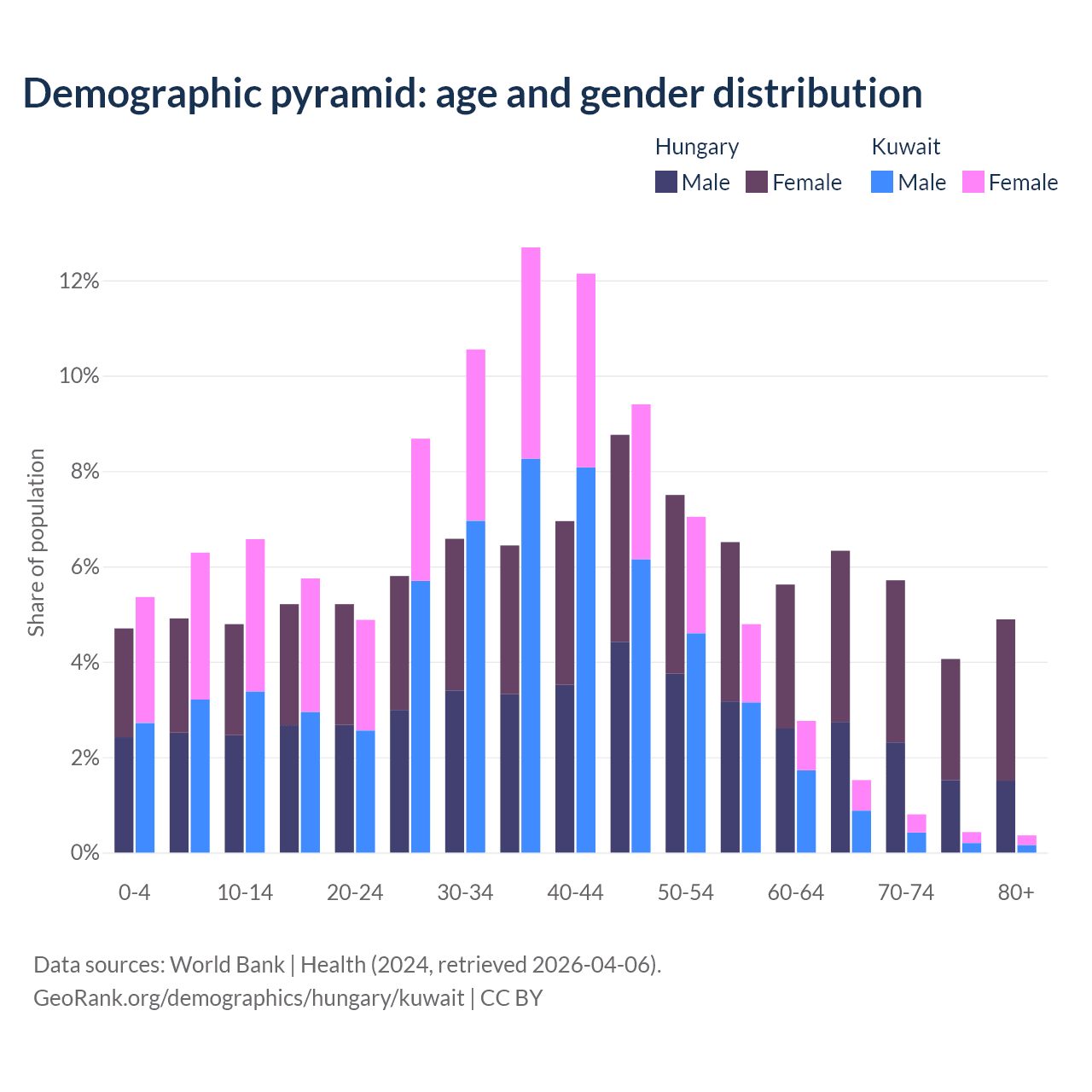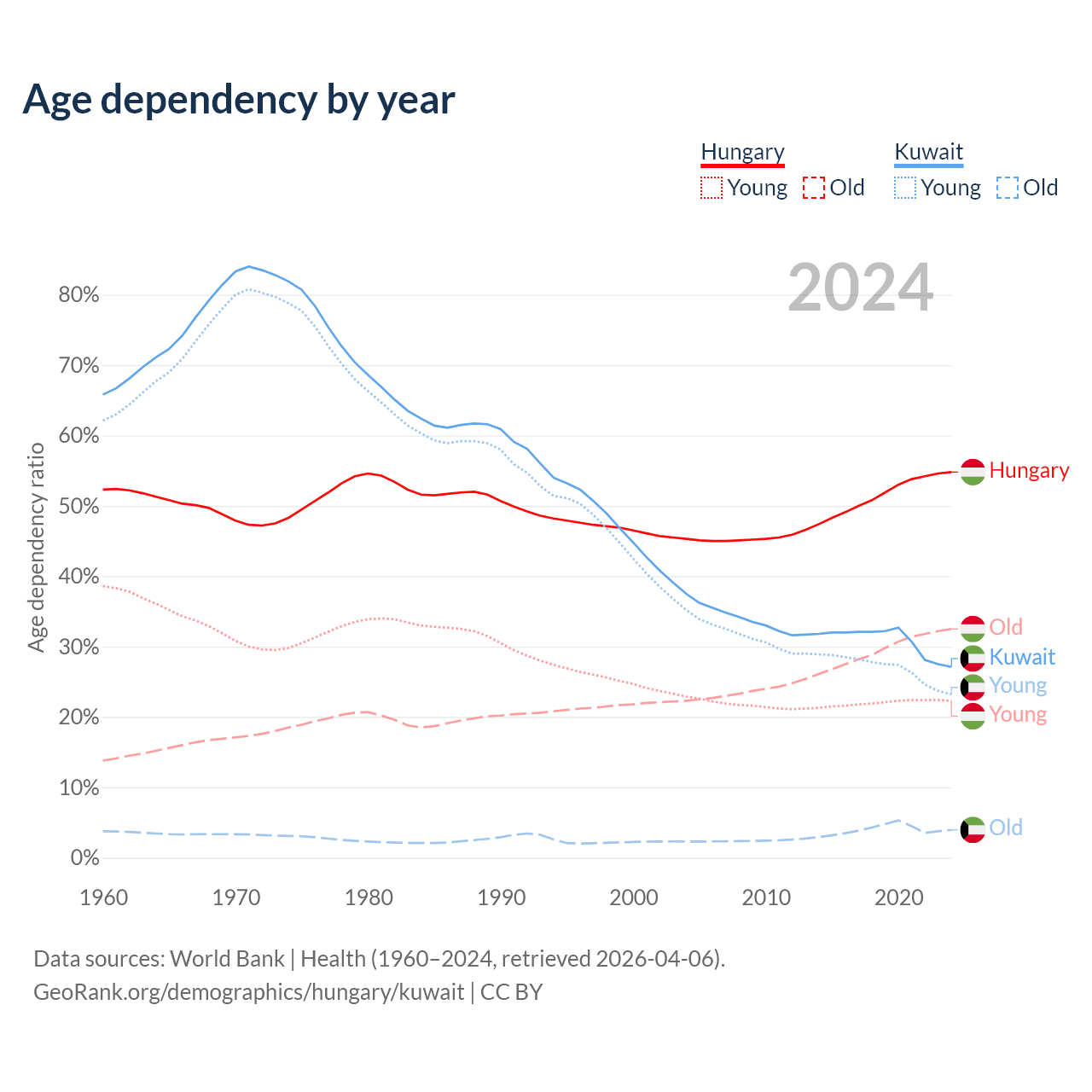 - Hungary is ranked 17/196 by median age (oldest to youngest) vs 71/196 for Kuwait.