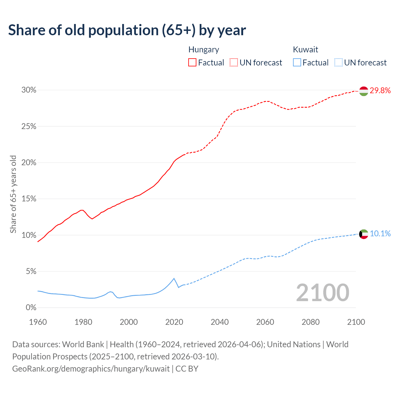 The share of older people aged 65 and over is 21% in Hungary and 3.1% in Kuwait. Life expectancy in Hungary compared to Kuwait .