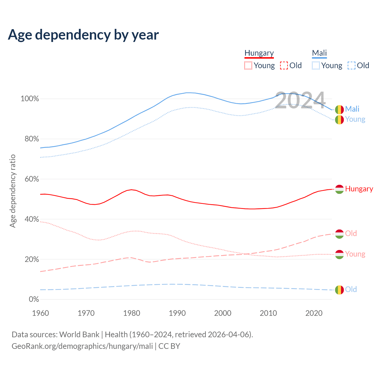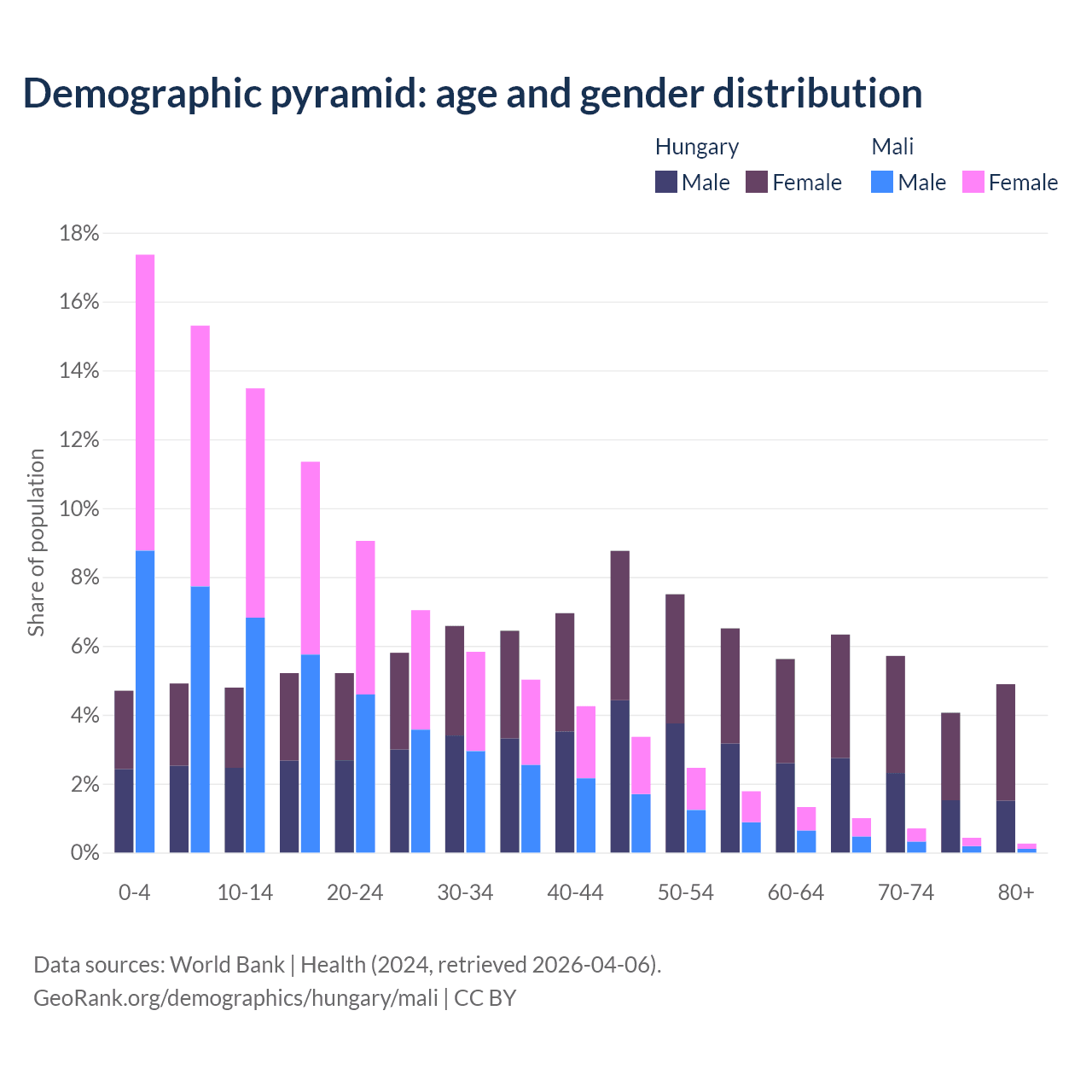 - Hungary is ranked 17/196 by median age (oldest to youngest) vs 193/196 for Mali.