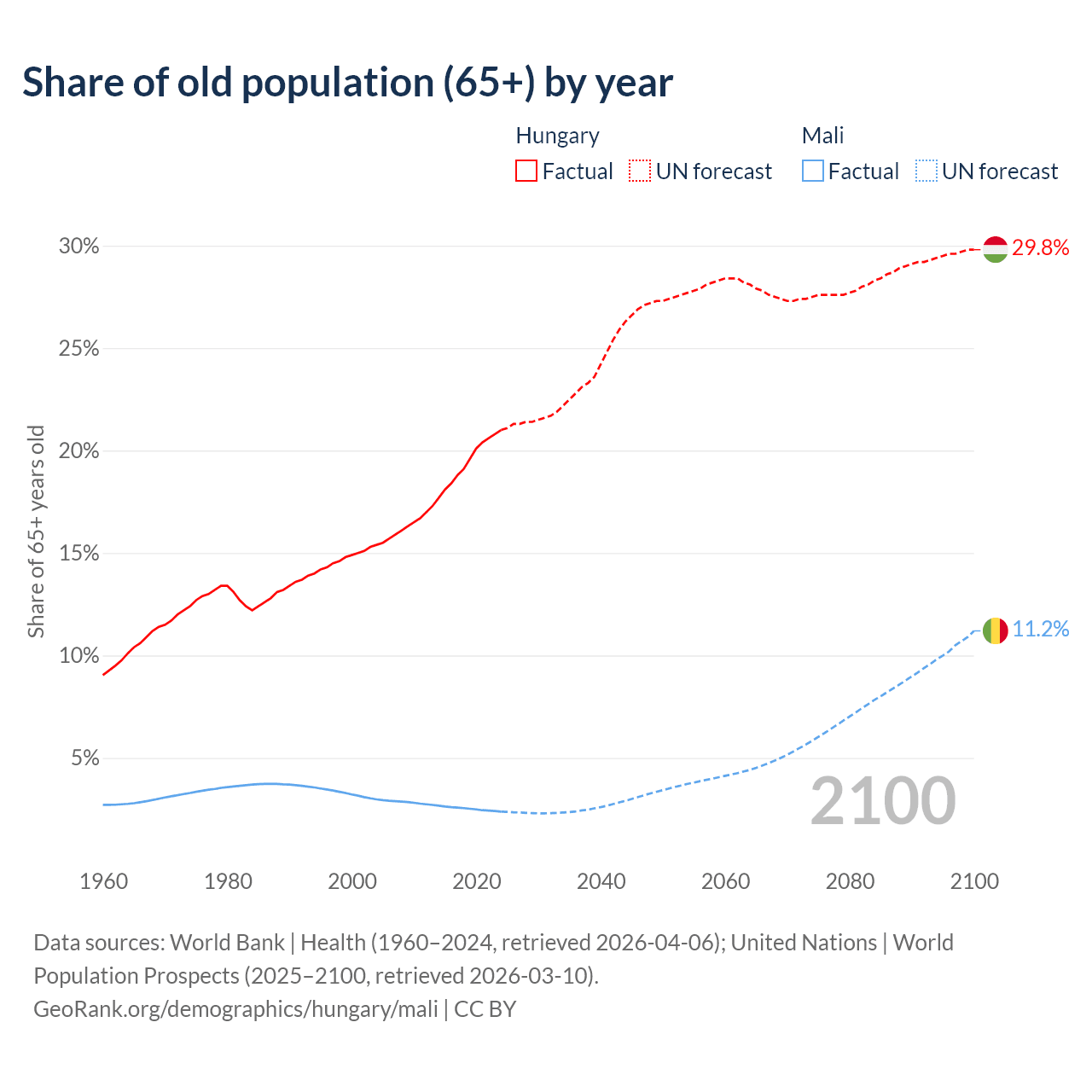 The share of older people aged 65 and over is 21% in Hungary and 2.38% in Mali. Life expectancy in Hungary compared to Mali .