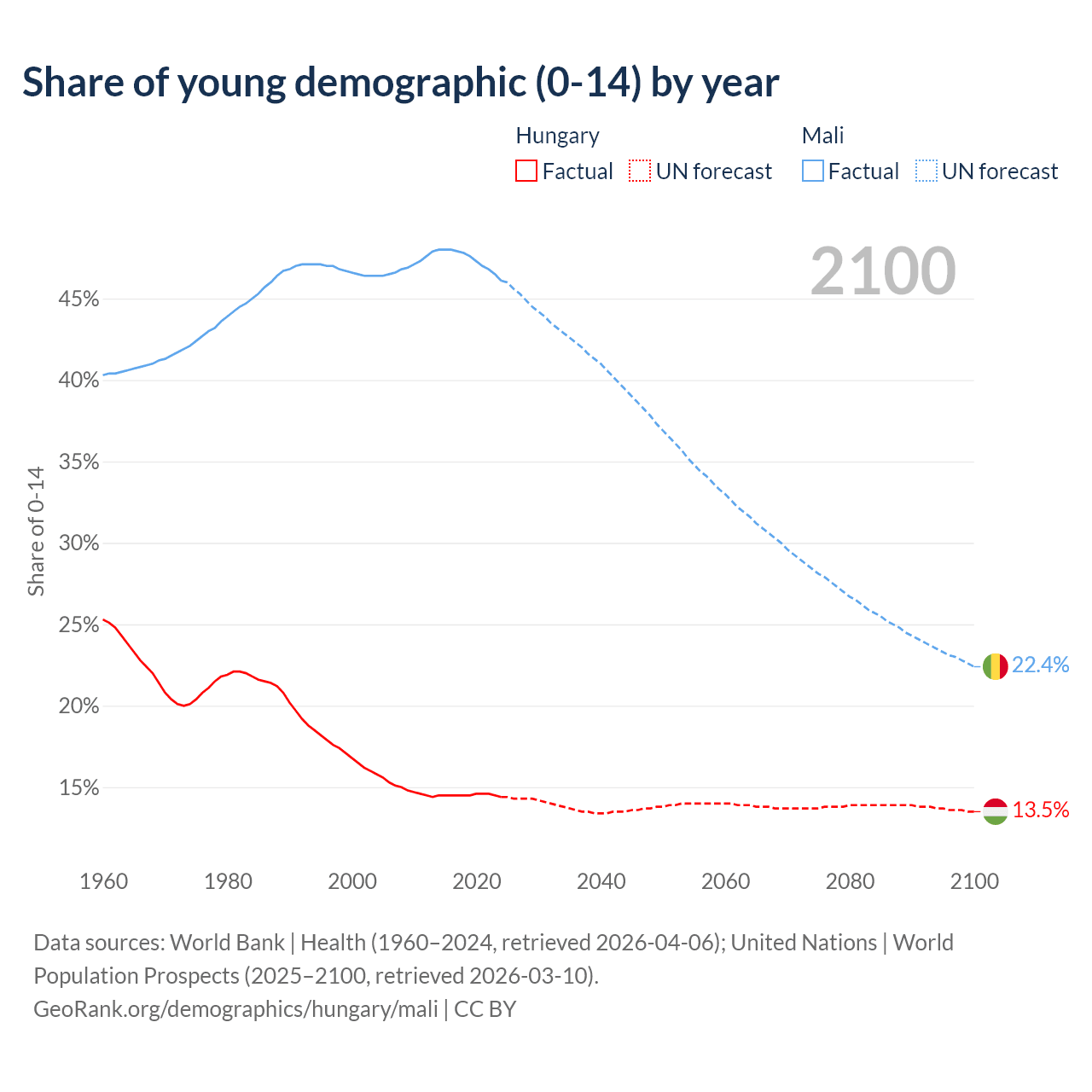 - The share of young demographic (0-15 years old) in Hungary is 14.4% vs 46.1% in Mali.