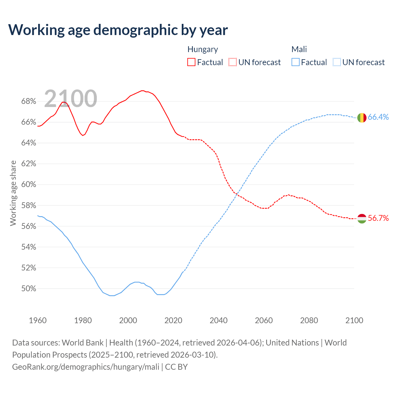 - Hungary has 6.12M working age adults (aged 15-64) vs 13.5M in Mali.