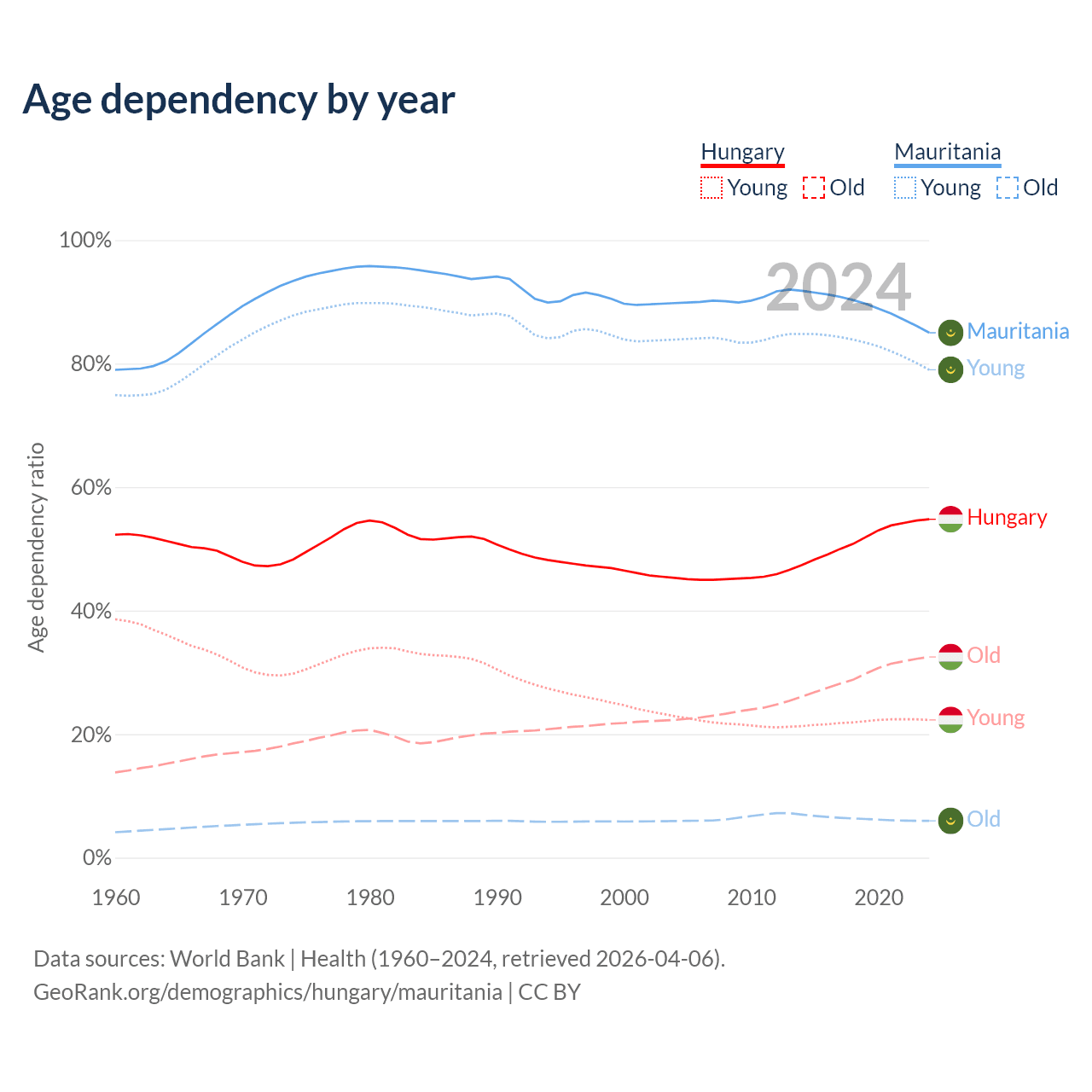 Data sources: World Bank | Health (1960–2024, retrieved 2026-04-06); U.S. Census Bureau (1960–2024, retrieved 2026-02-08).