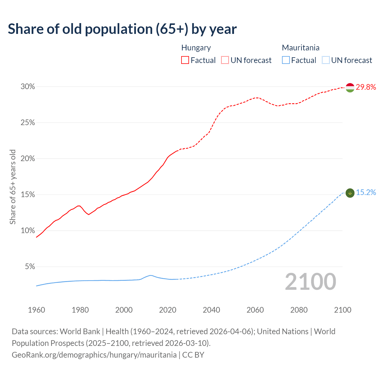 Median age Hungary vs Mauritania, 1960-2100