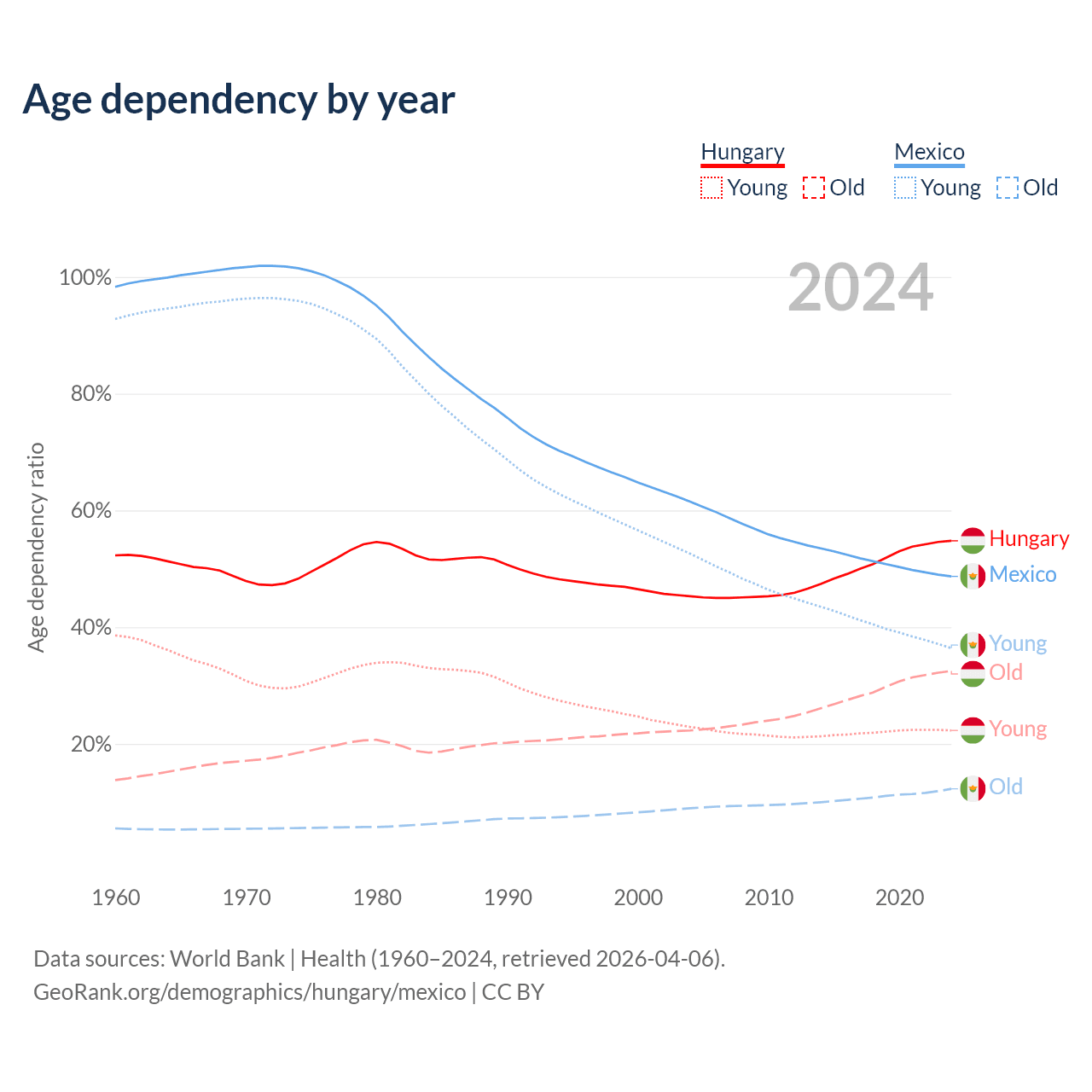 Data sources: World Bank | Health (1960–2024, retrieved 2026-04-06); U.S. Census Bureau (1960–2024, retrieved 2026-02-08).