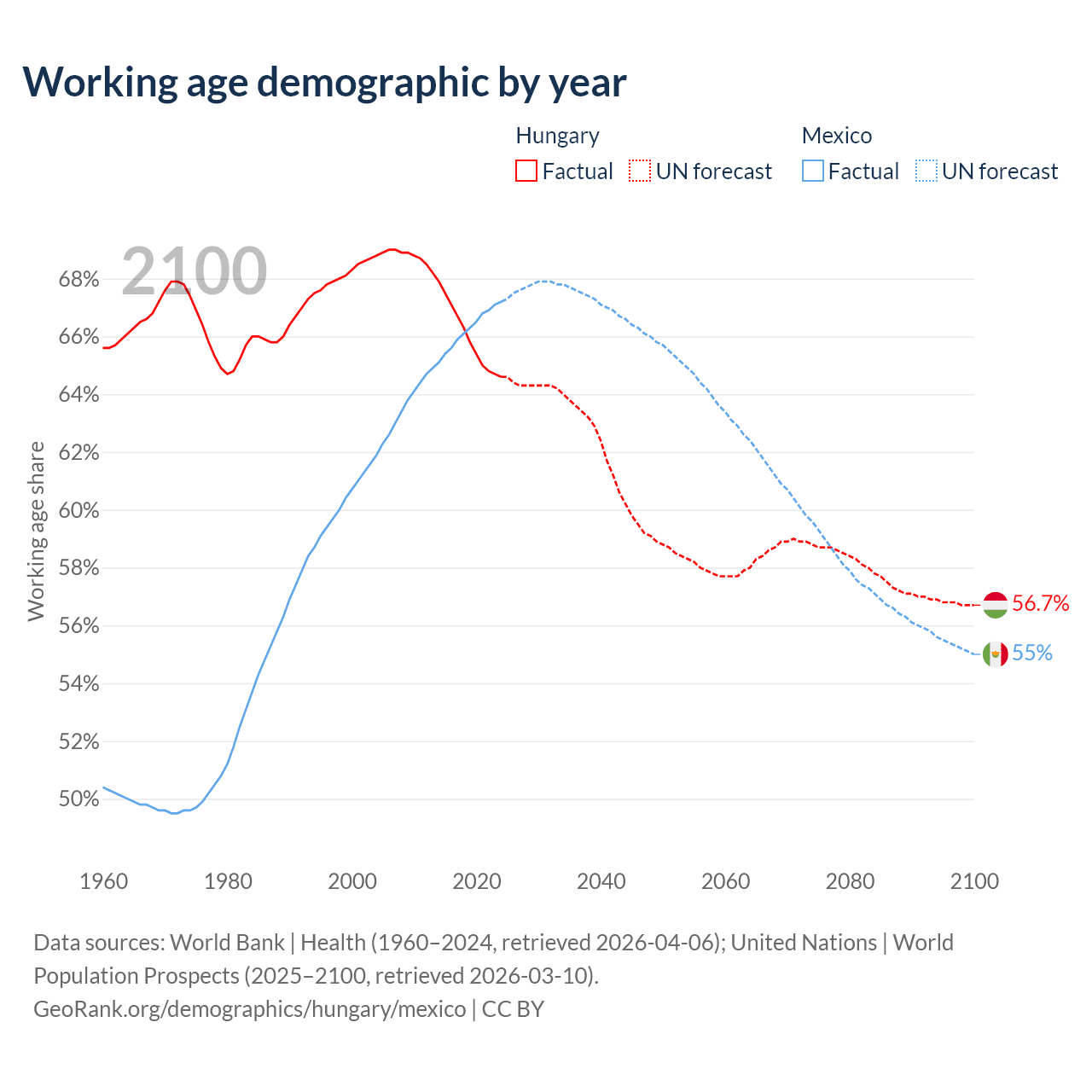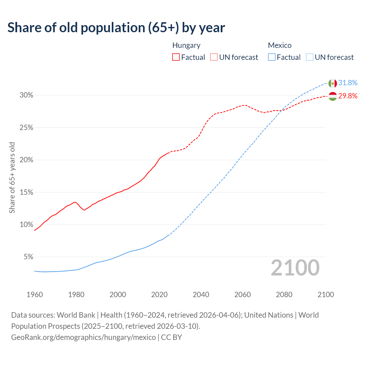 Median age Hungary vs Mexico, 1960-2100