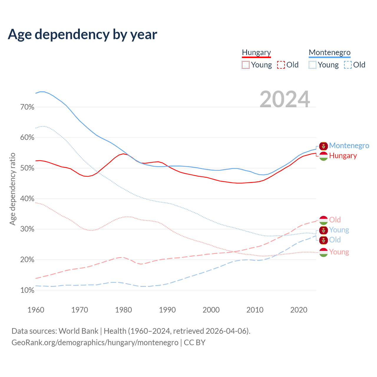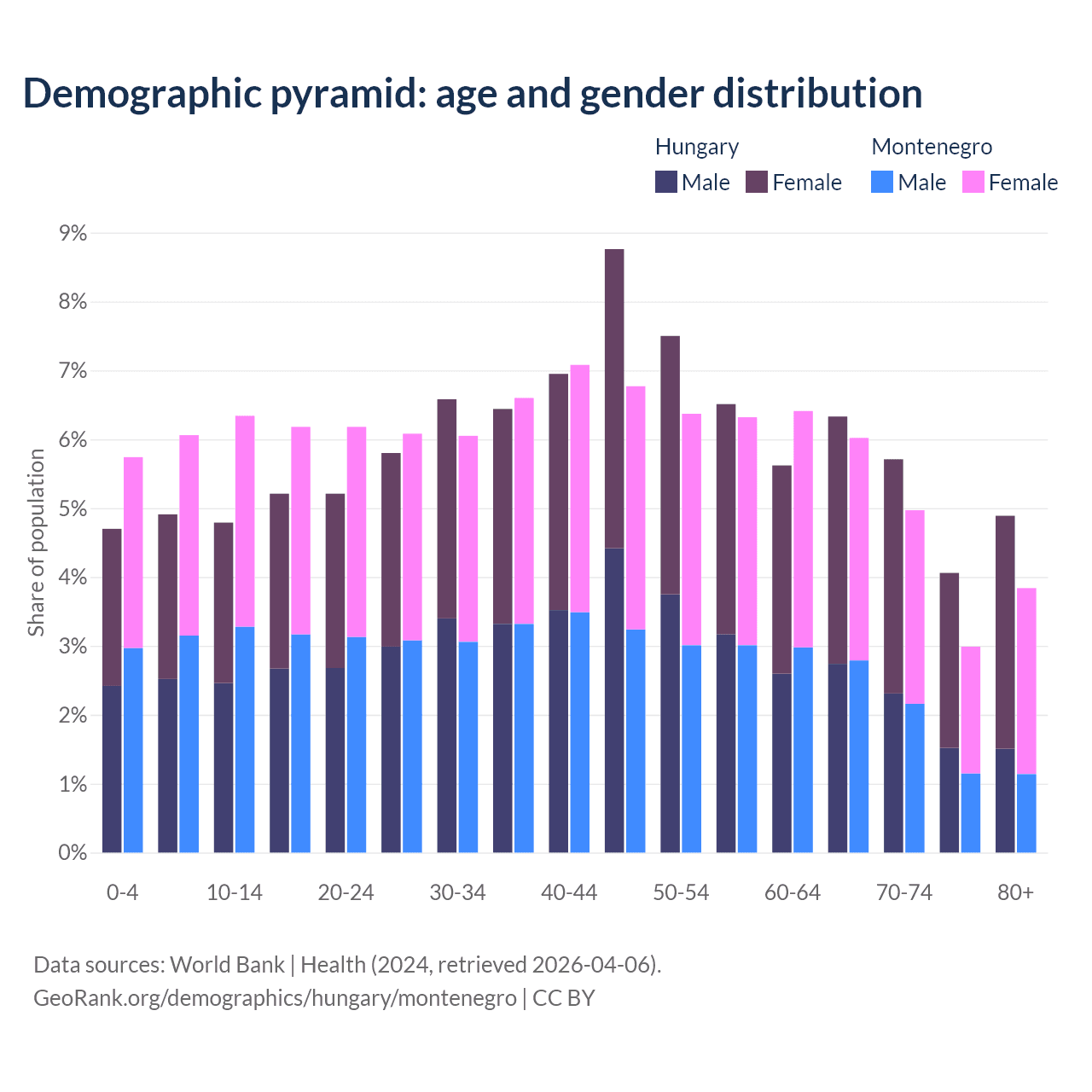 - Hungary is ranked 17/196 by median age (oldest to youngest) vs 45/196 for Montenegro.