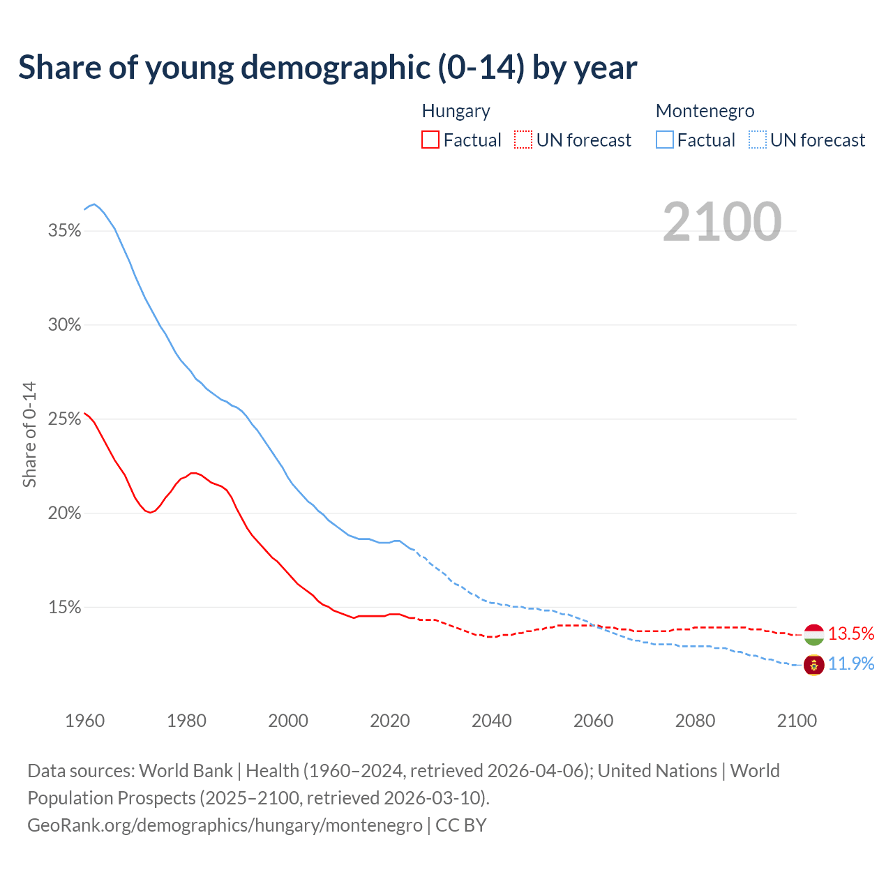 Median age Hungary vs Montenegro, 1960-2100