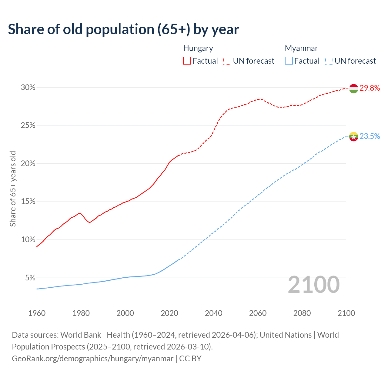 The share of older people aged 65 and over is 21% in Hungary and 7.3% in Myanmar. Life expectancy in Hungary compared to Myanmar .