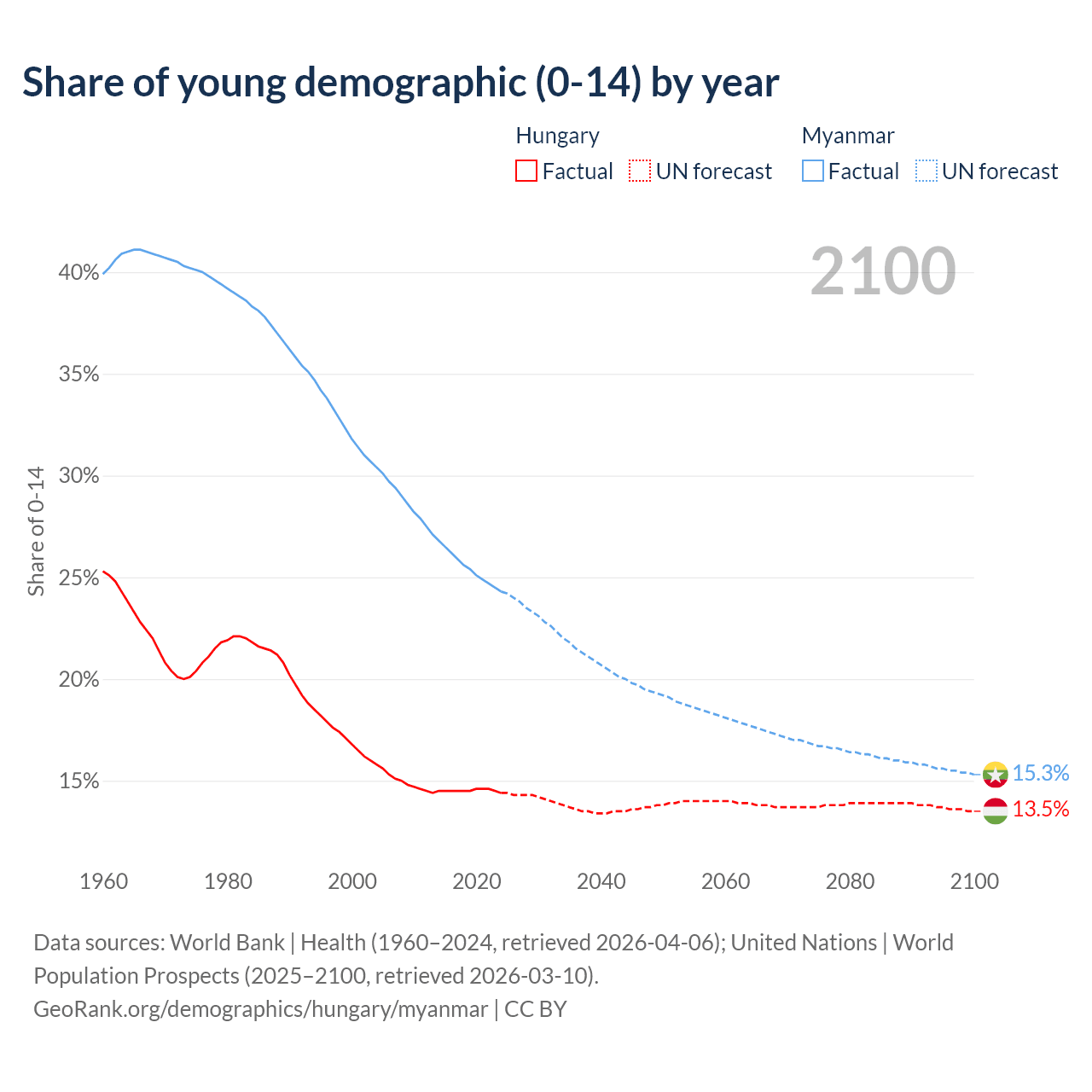 - The share of young demographic (0-15 years old) in Hungary is 14.4% vs 24.3% in Myanmar.