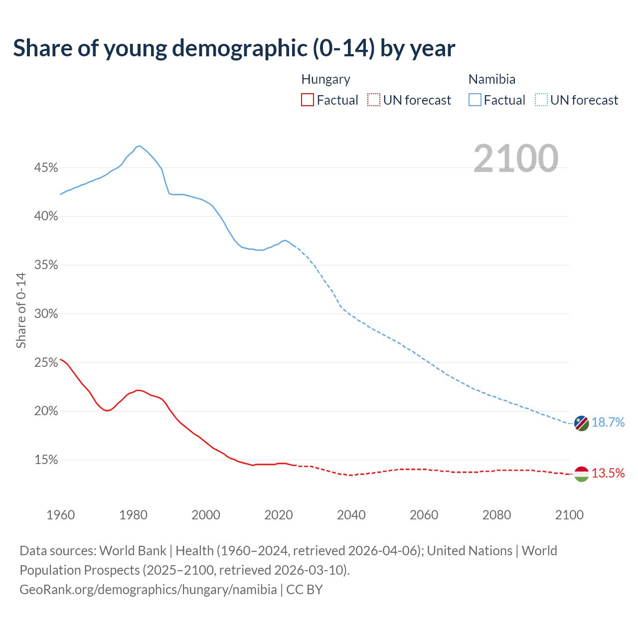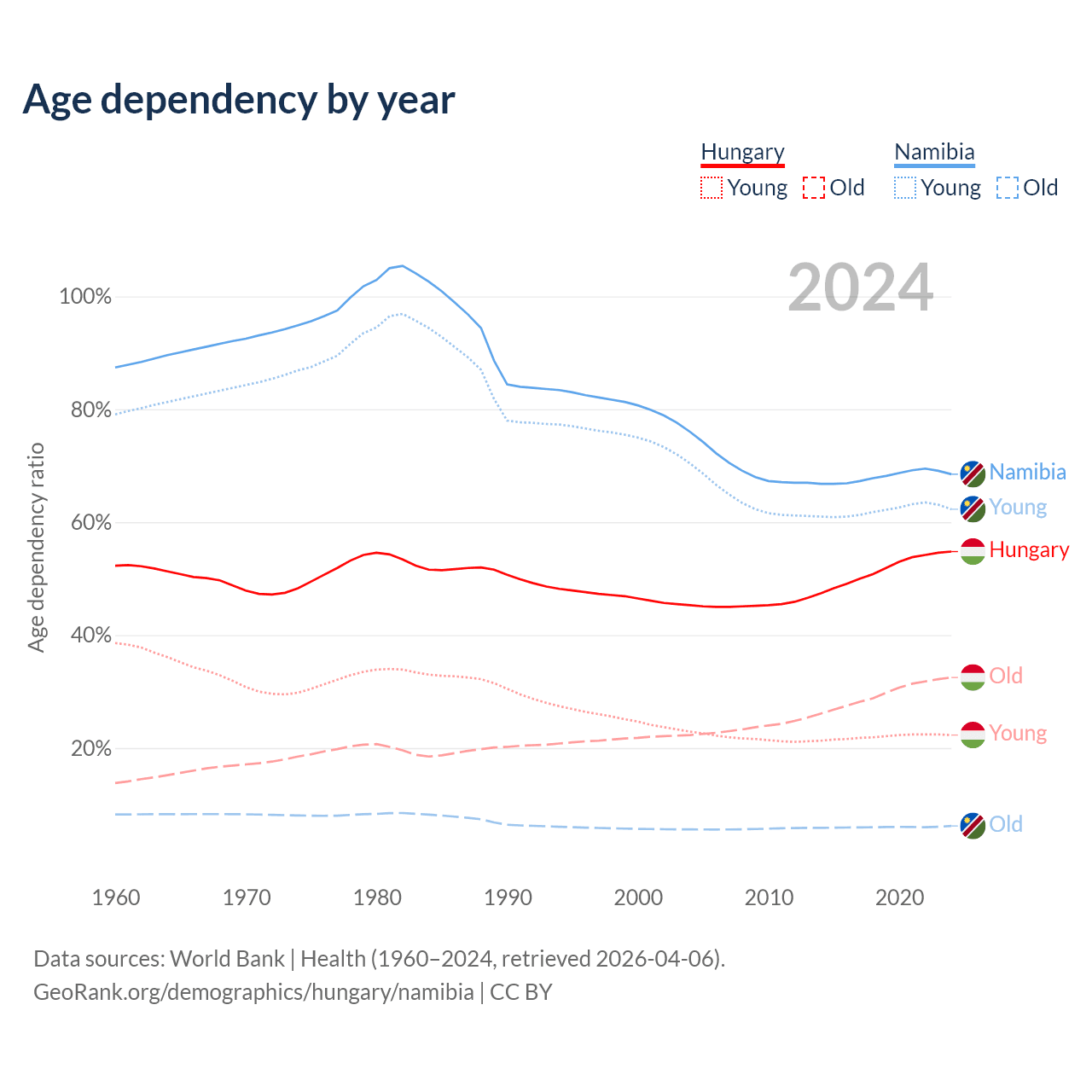 - Hungary is ranked 17/196 by median age (oldest to youngest) vs 147/196 for Namibia.