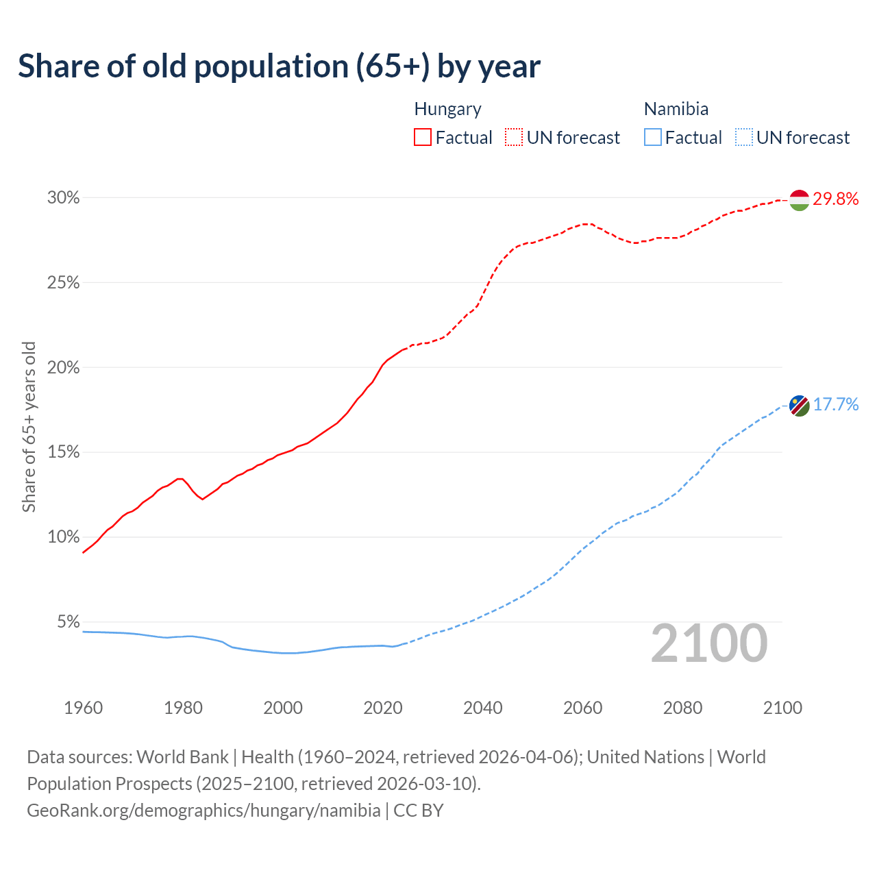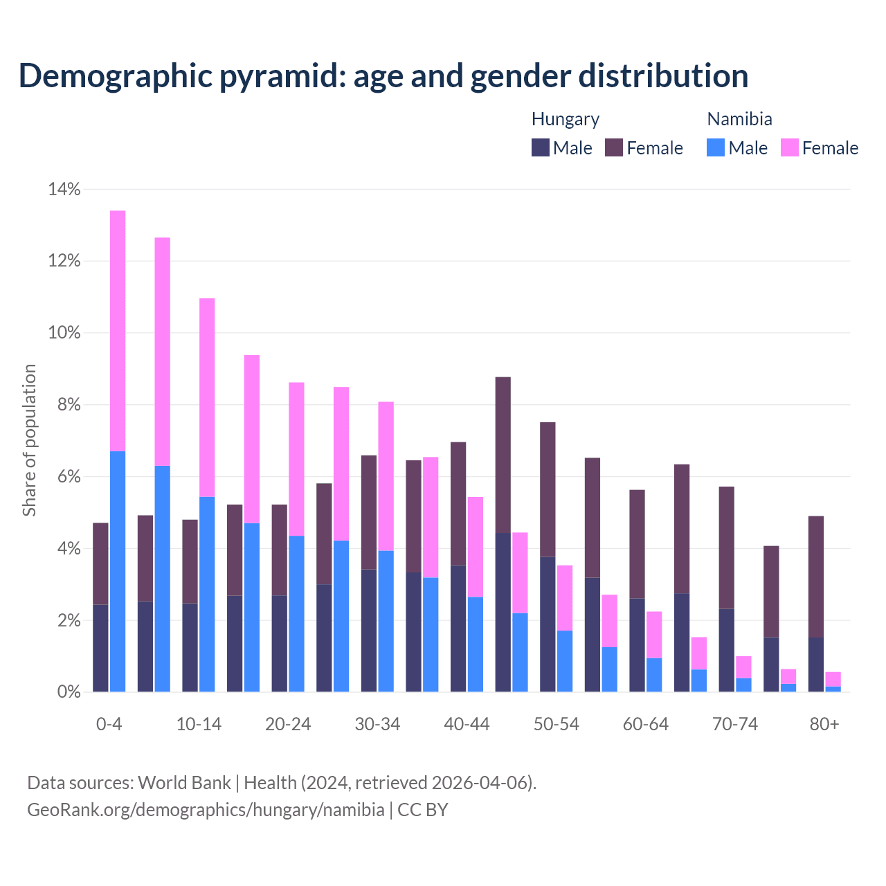The share of older people aged 65 and over is 21% in Hungary and 3.67% in Namibia. Life expectancy in Hungary compared to Namibia .