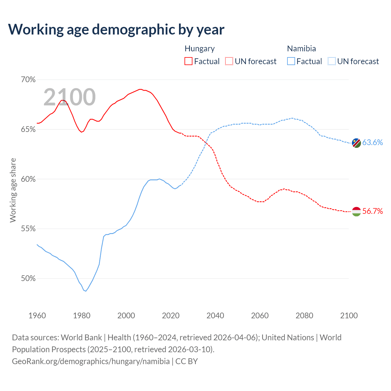 - Hungary has 6.12M working age adults (aged 15-64) vs 1.88M in Namibia.