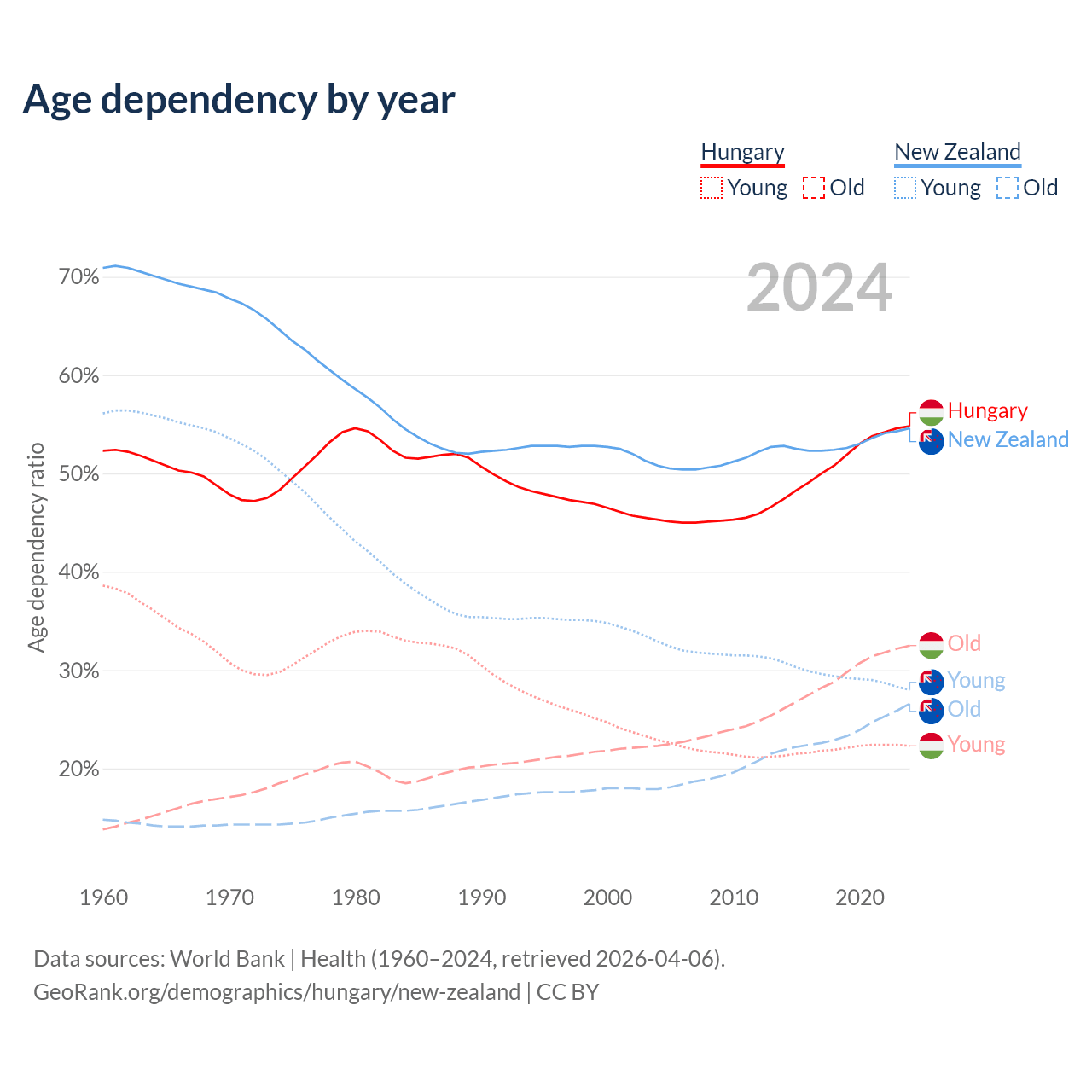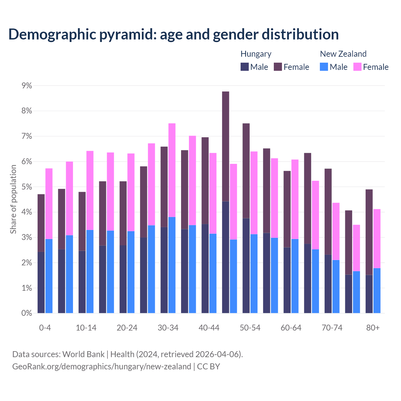 - Hungary is ranked 17/196 by median age (oldest to youngest) vs 56/196 for New Zealand.