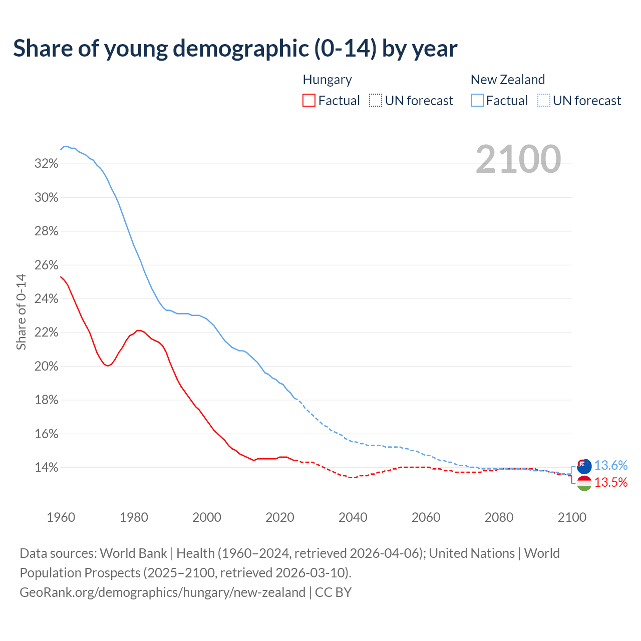 - The share of young demographic (0-15 years old) in Hungary is 14.4% vs 18.1% in New Zealand.