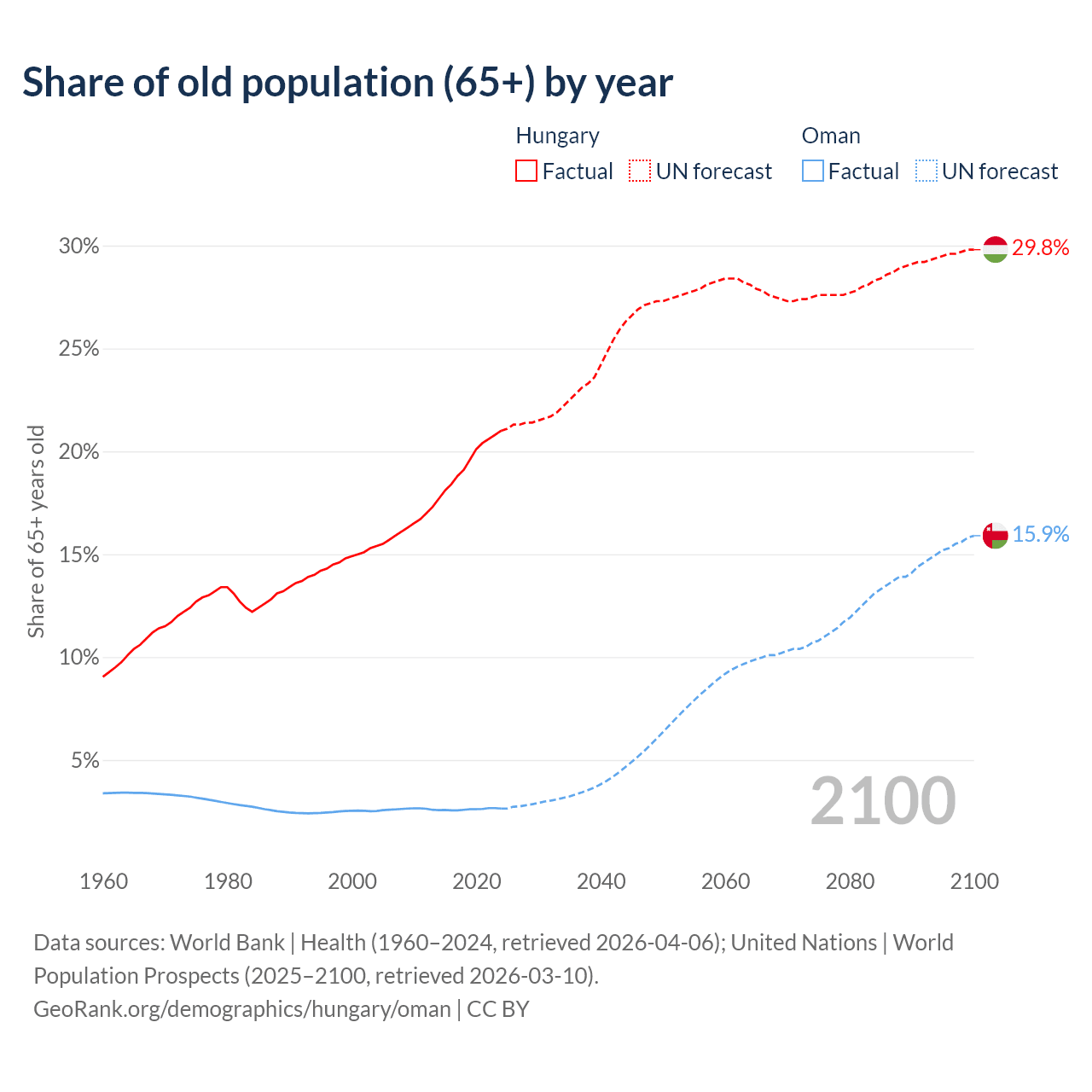 The share of older people aged 65 and over is 21% in Hungary and 2.64% in Oman. Life expectancy in Hungary compared to Oman .