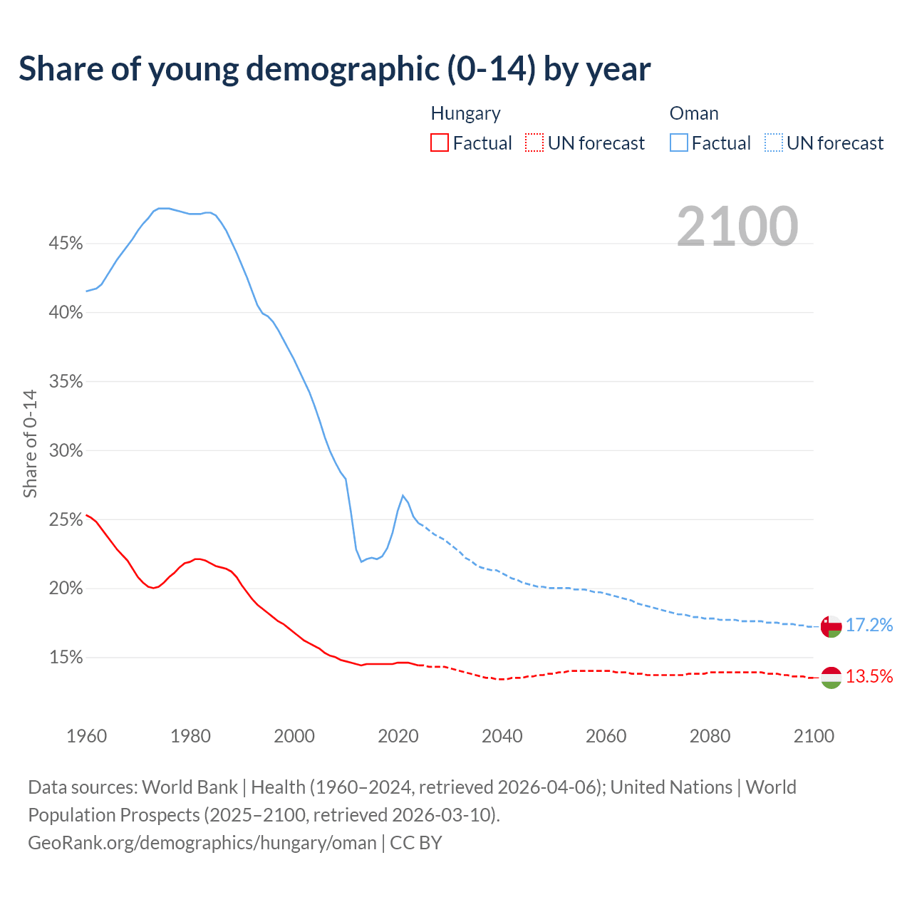 - The share of young demographic (0-15 years old) in Hungary is 14.4% vs 24.7% in Oman.