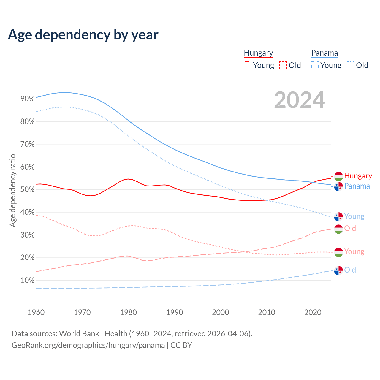 - Hungary is ranked 17/196 by median age (oldest to youngest) vs 94/196 for Panama.