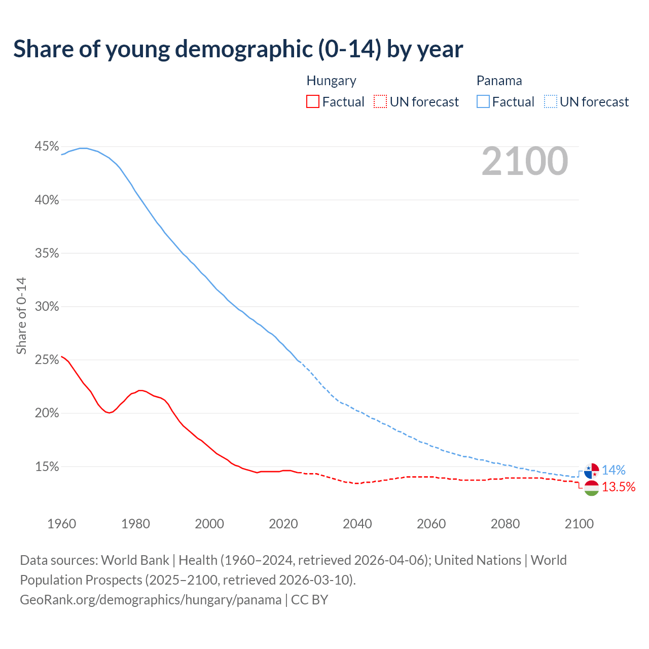 - The share of young demographic (0-15 years old) in Hungary is 14.4% vs 24.9% in Panama.