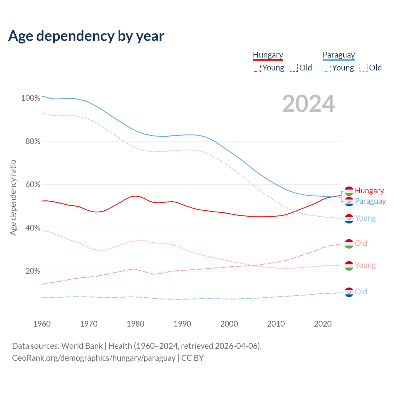 Data sources: World Bank | Health (1960–2024, retrieved 2026-04-06); U.S. Census Bureau (1960–2024, retrieved 2026-02-08).