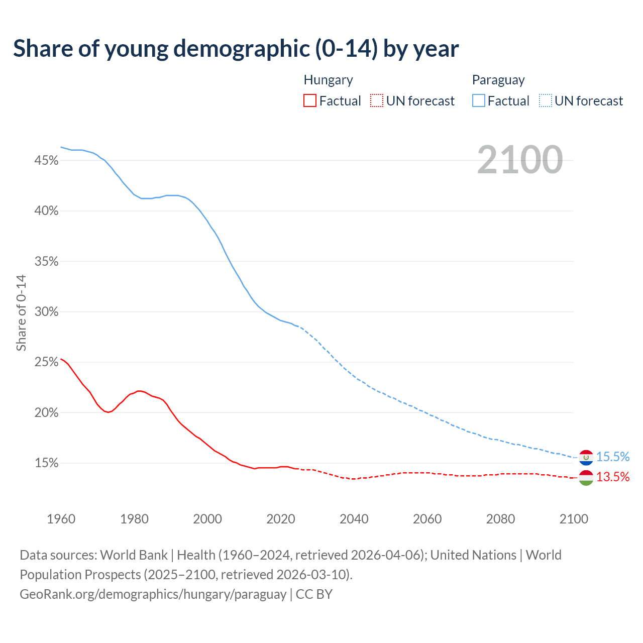 - The share of young demographic (0-15 years old) in Hungary is 14.4% vs 28.6% in Paraguay.