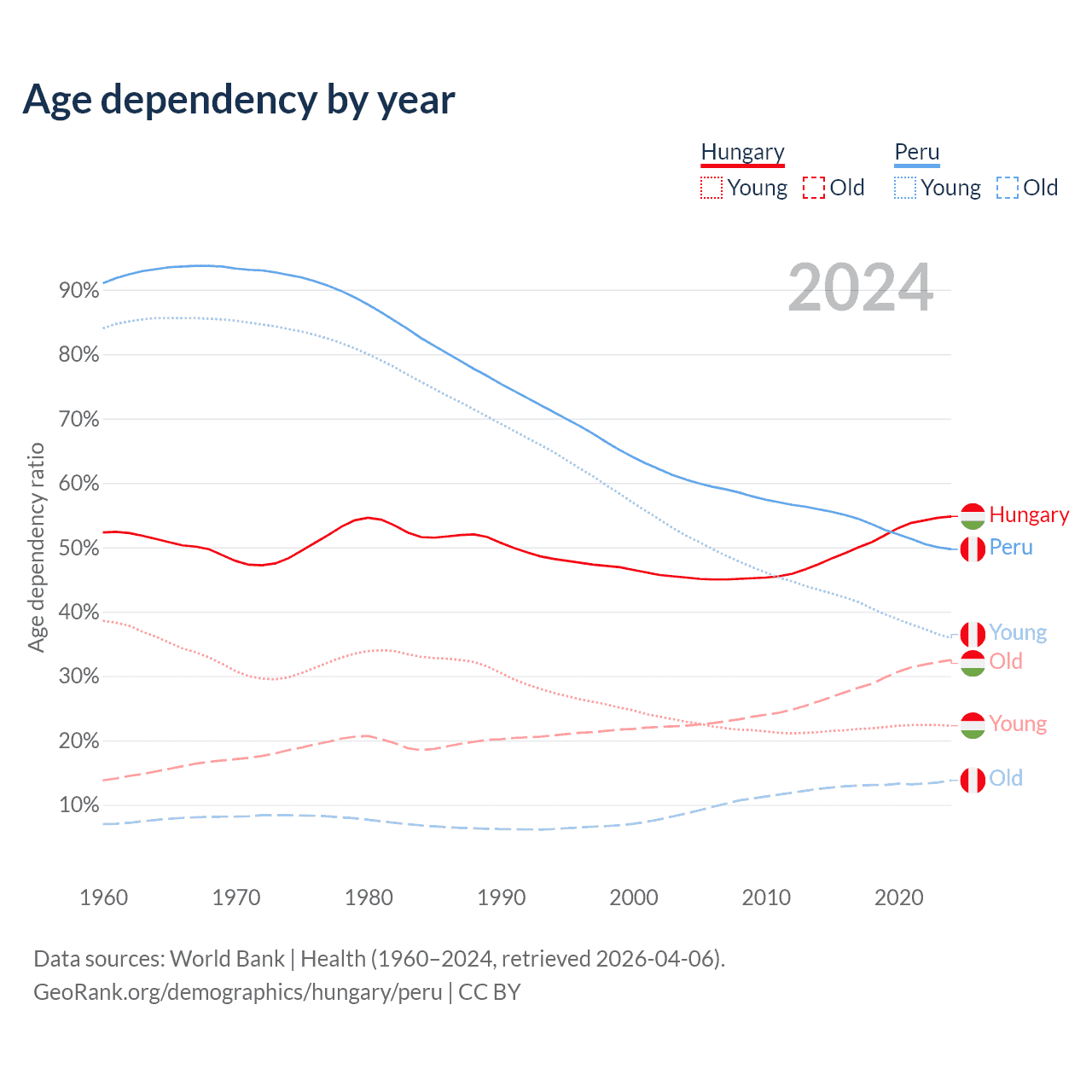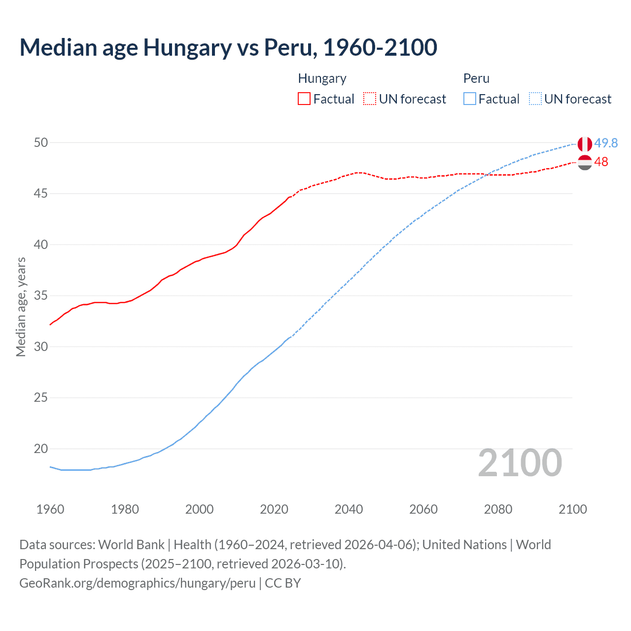 - Hungary is ranked 17/196 by median age (oldest to youngest) vs 97/196 for Peru.