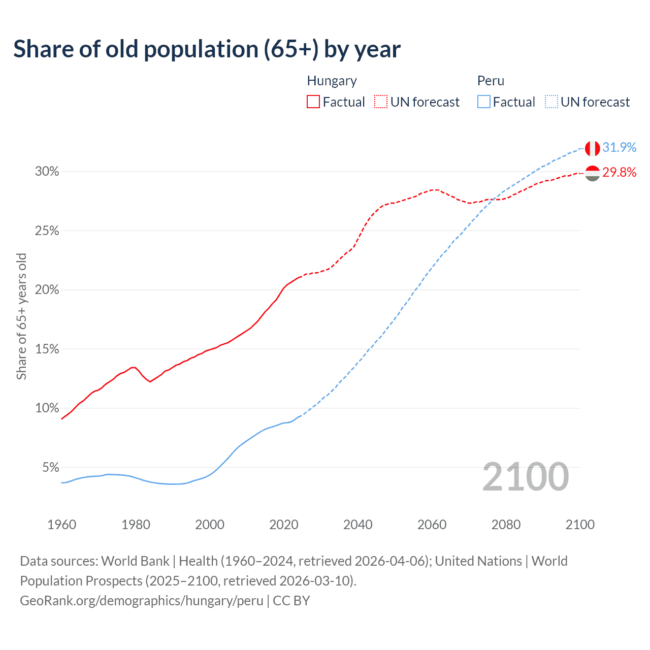 The share of older people aged 65 and over is 21% in Hungary and 9.23% in Peru. Life expectancy in Hungary compared to Peru .