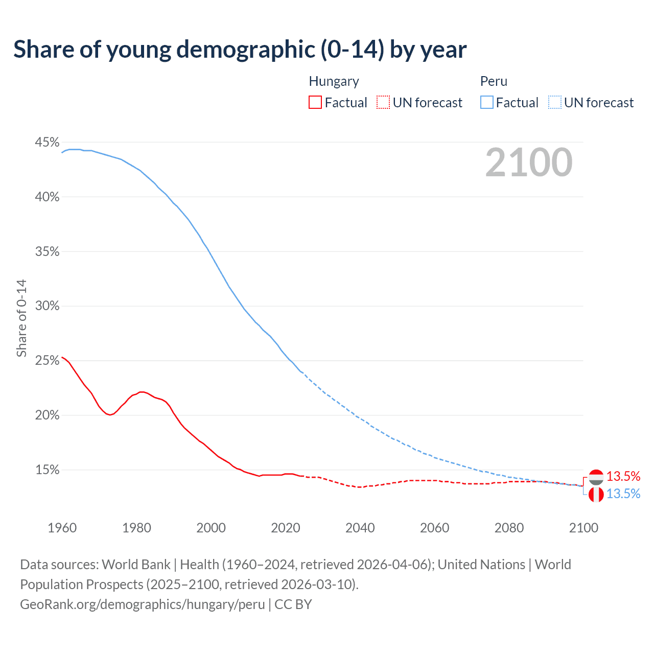 - The share of young demographic (0-15 years old) in Hungary is 14.4% vs 24% in Peru.