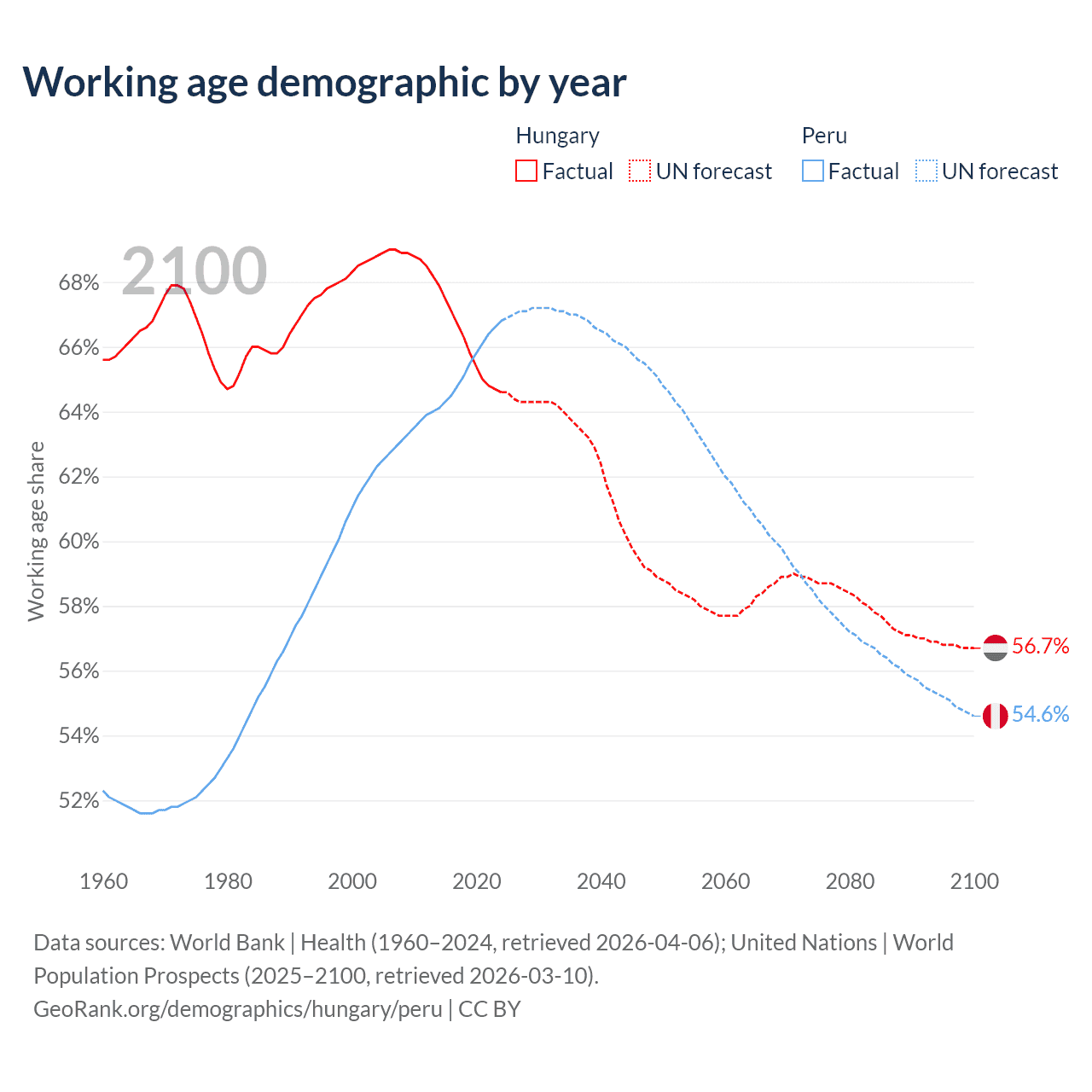 - Hungary has 6.12M working age adults (aged 15-64) vs 23.4M in Peru.
