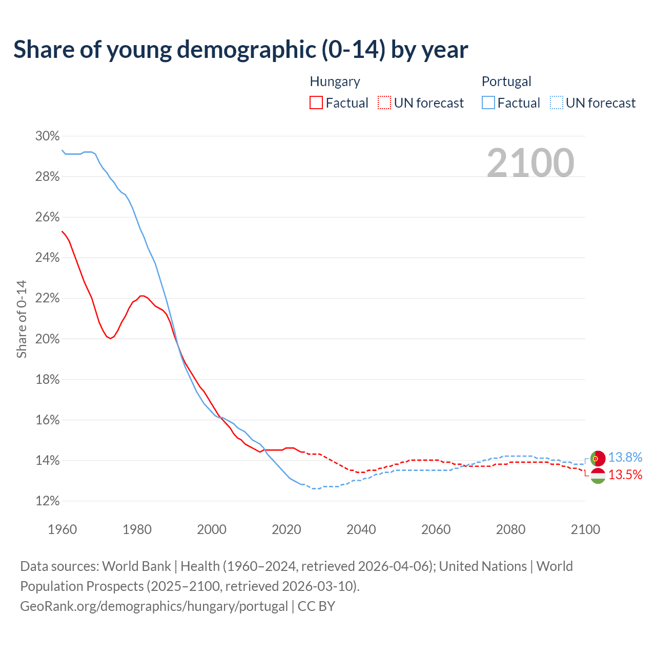- Hungary is ranked 17/196 by median age (oldest to youngest) vs 5/196 for Portugal.