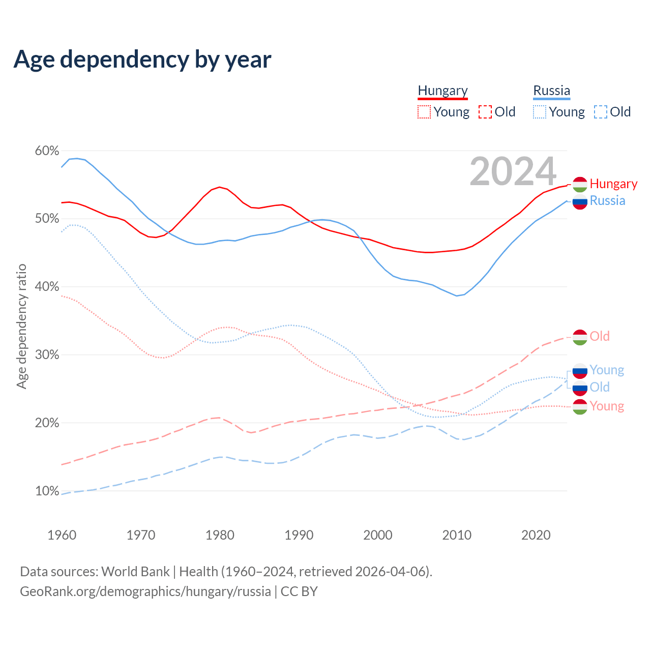 - Hungary is ranked 17/196 by median age (oldest to youngest) vs 42/196 for Russia.
